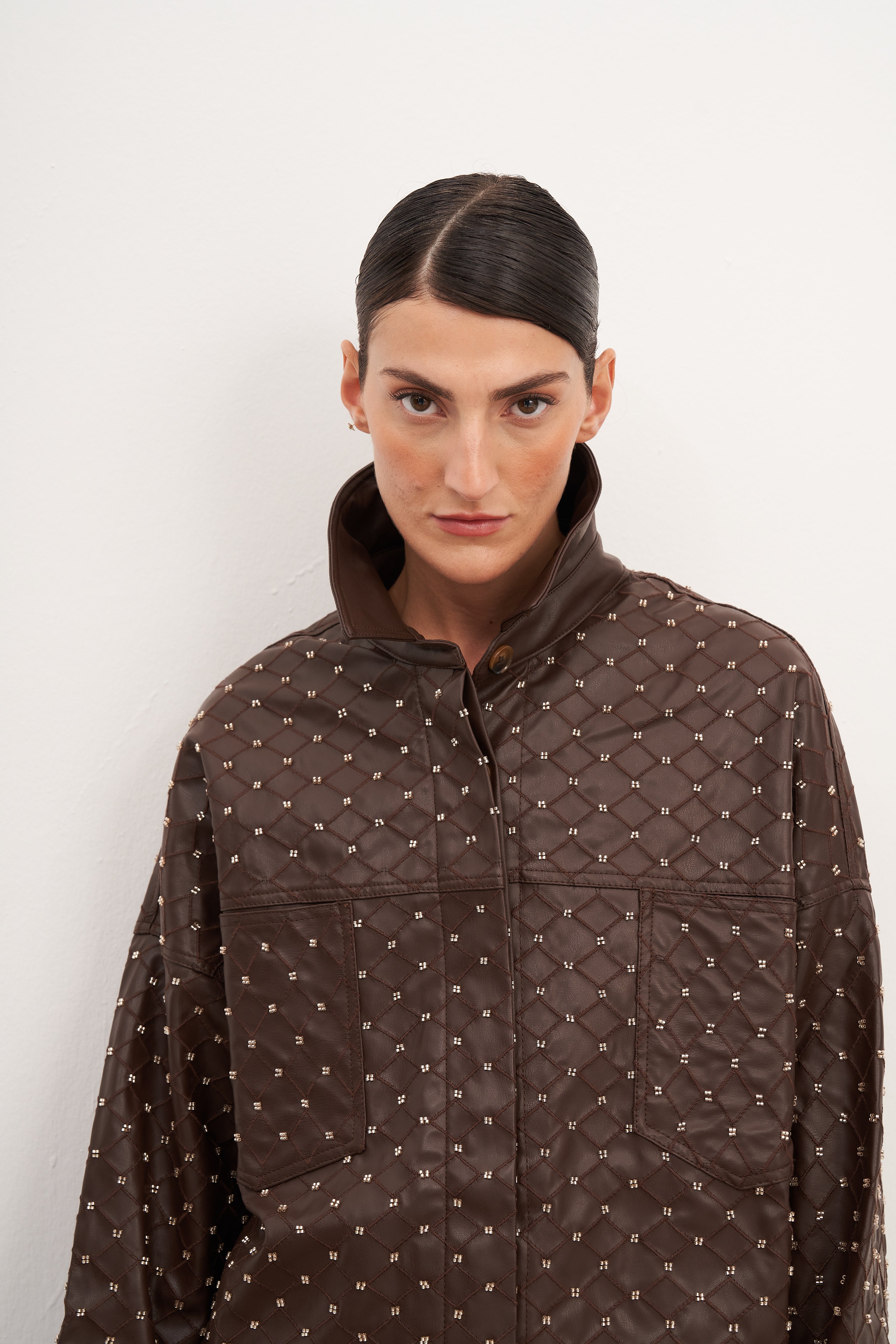 WINGCOTT Acı Kahve Boncuk İşlemeli Oversize Gömlek Ceket