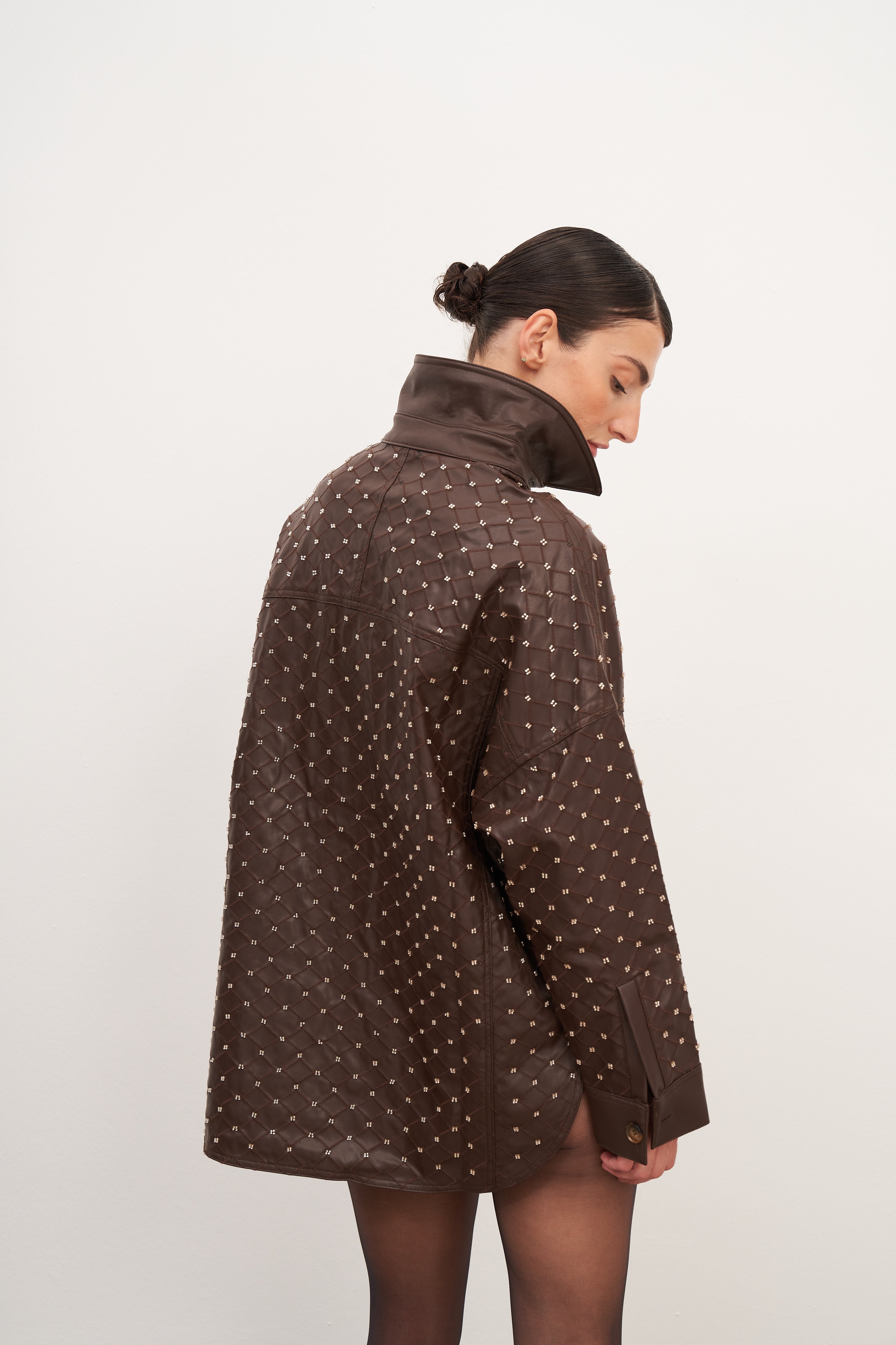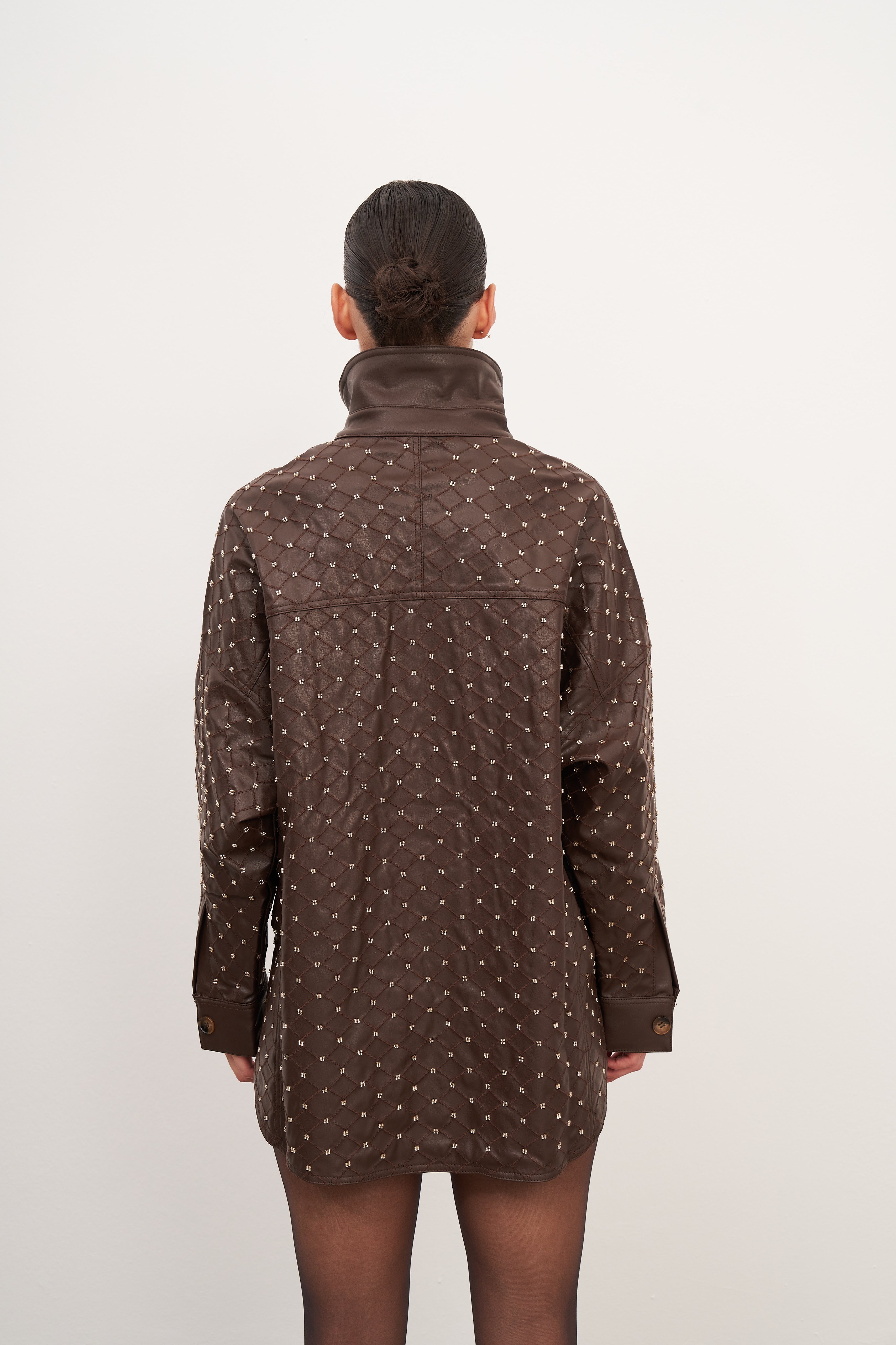 Acı Kahve Boncuk İşlemeli Oversize Gömlek Ceket