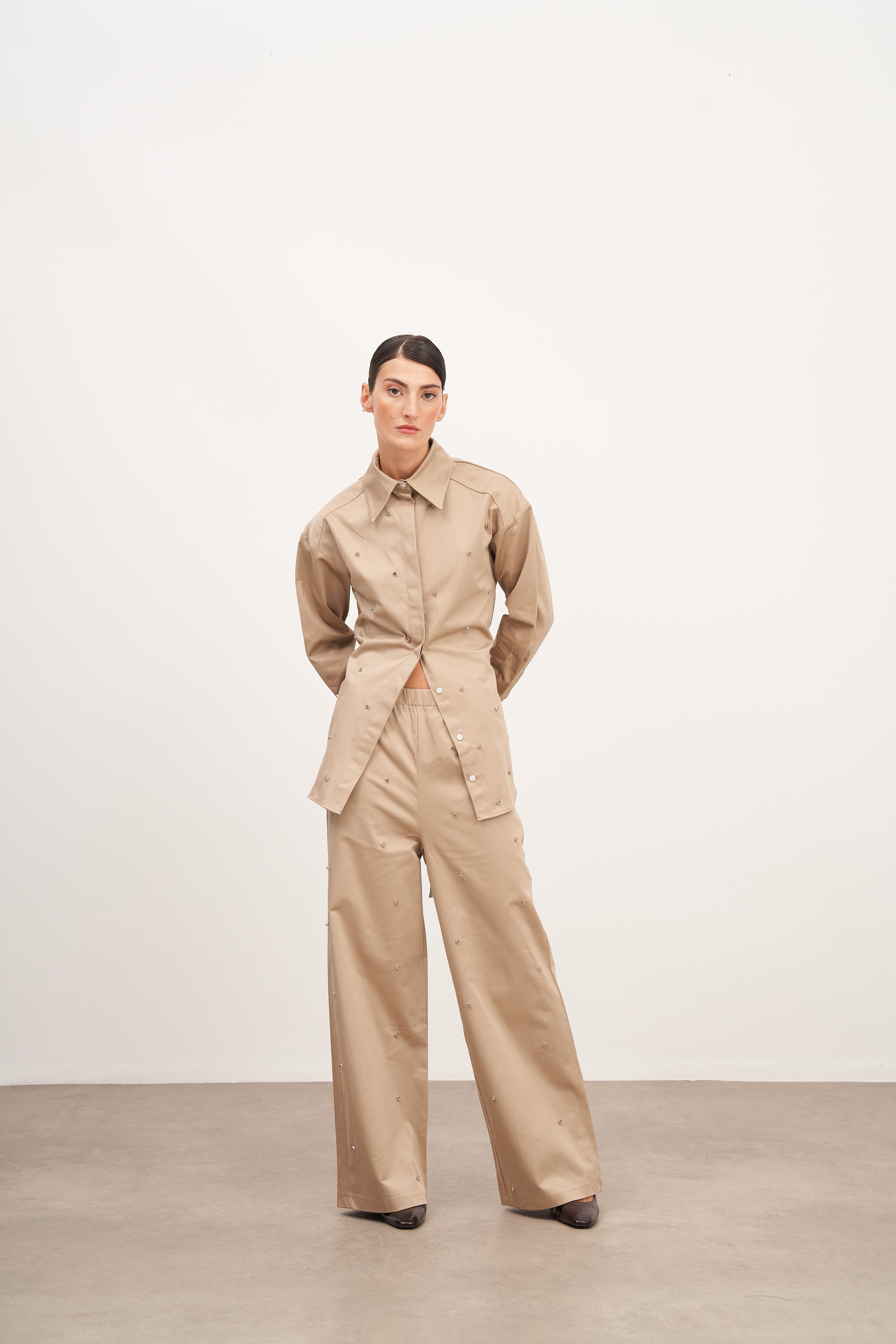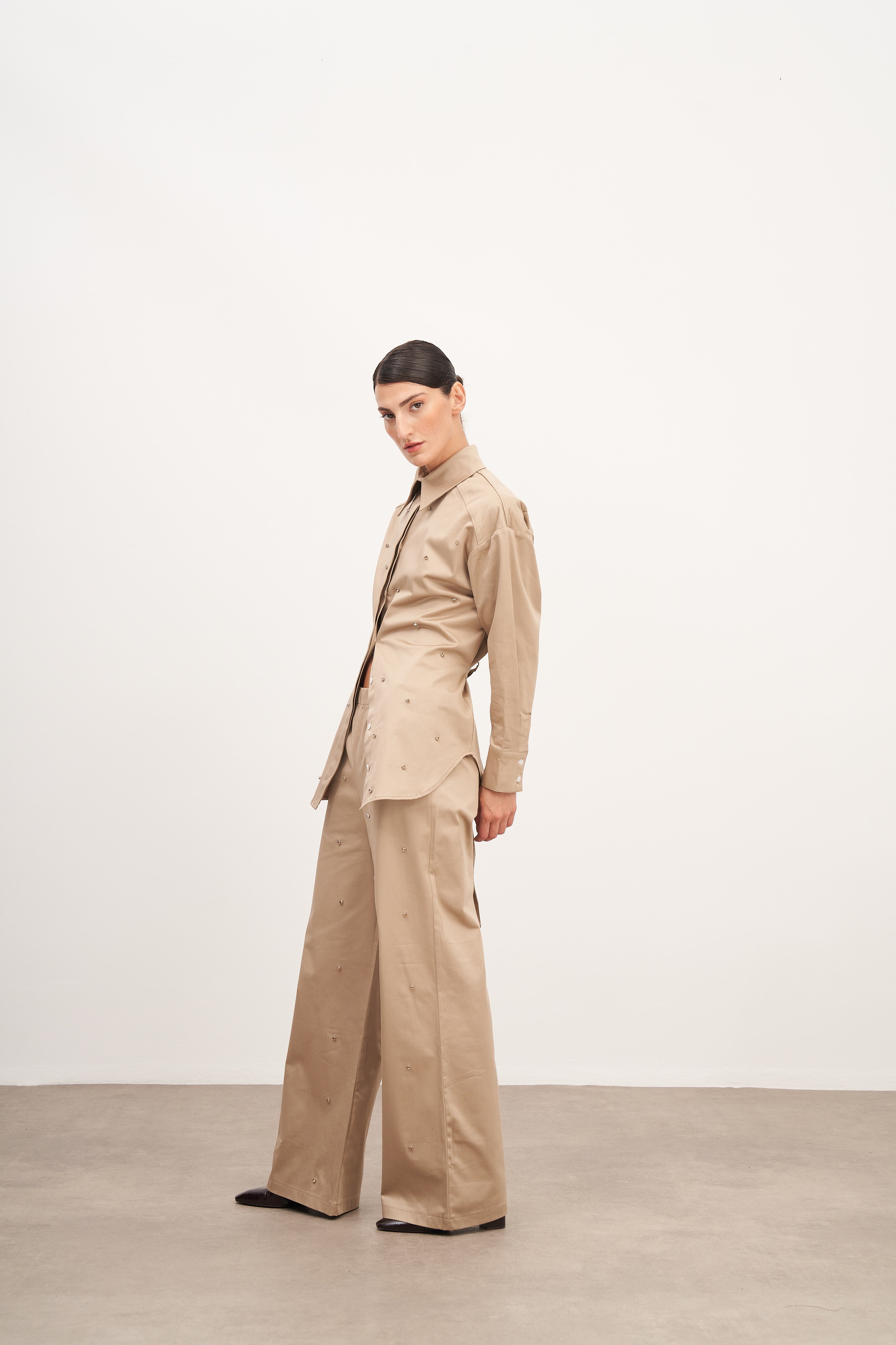 WINGCOTT Bej Taş İşlemeli Rahat Pantolon