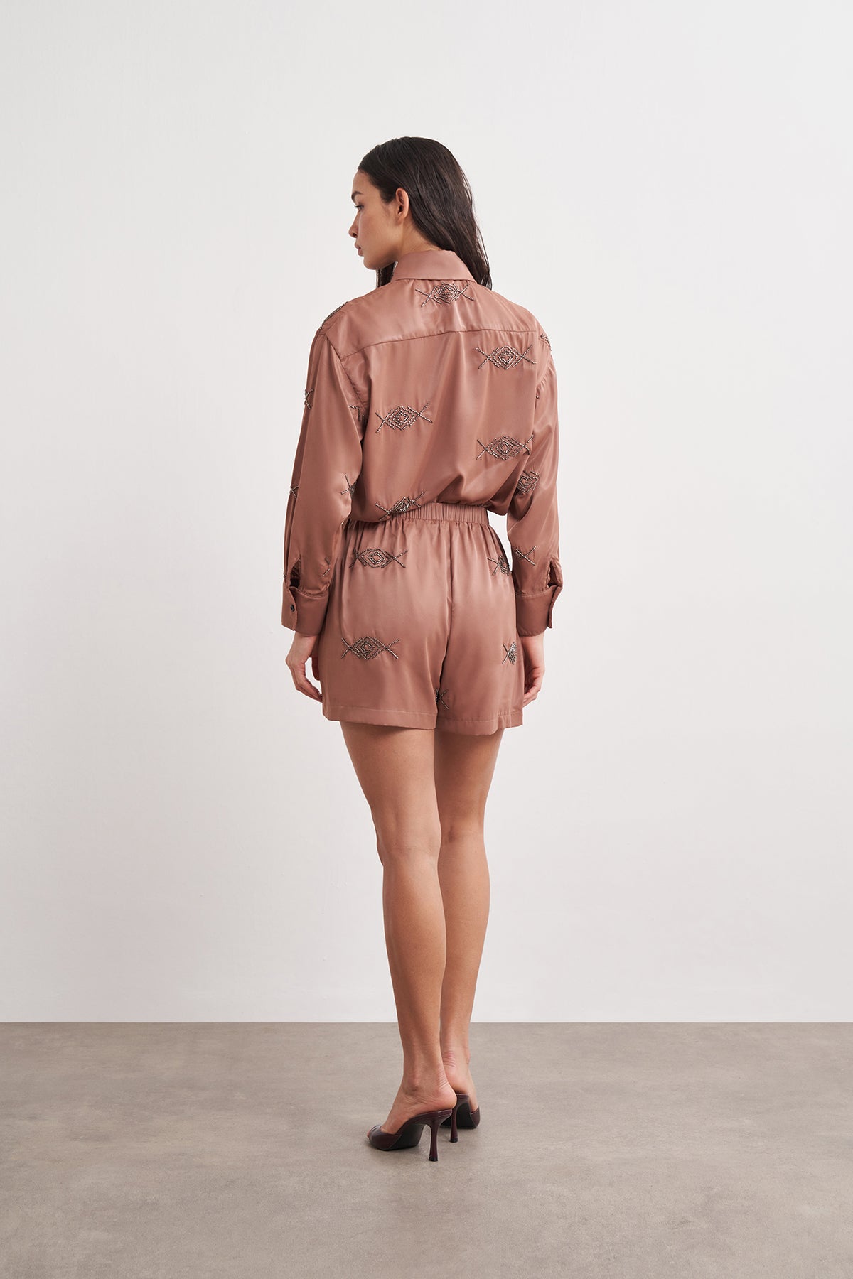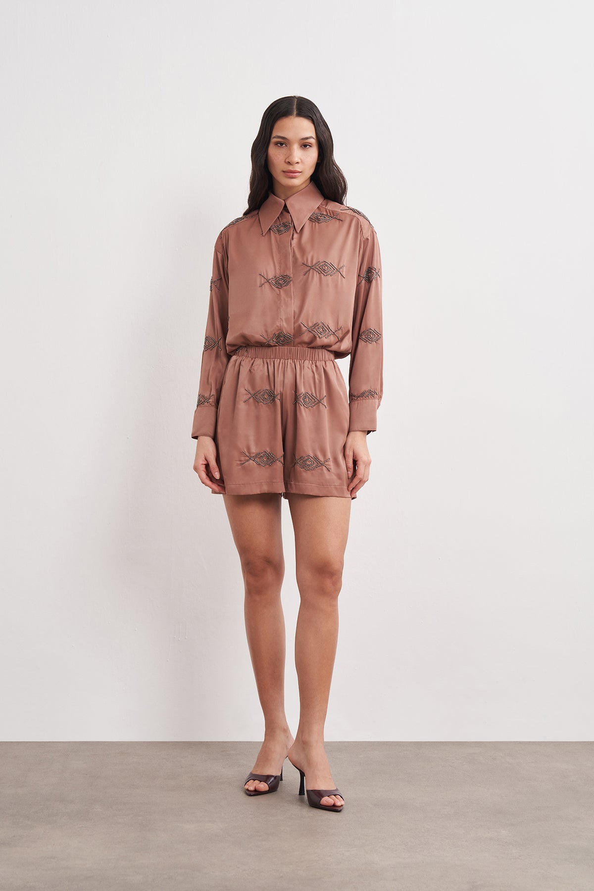 Boncuk İşlemeli Saten Dokulu Gömlek