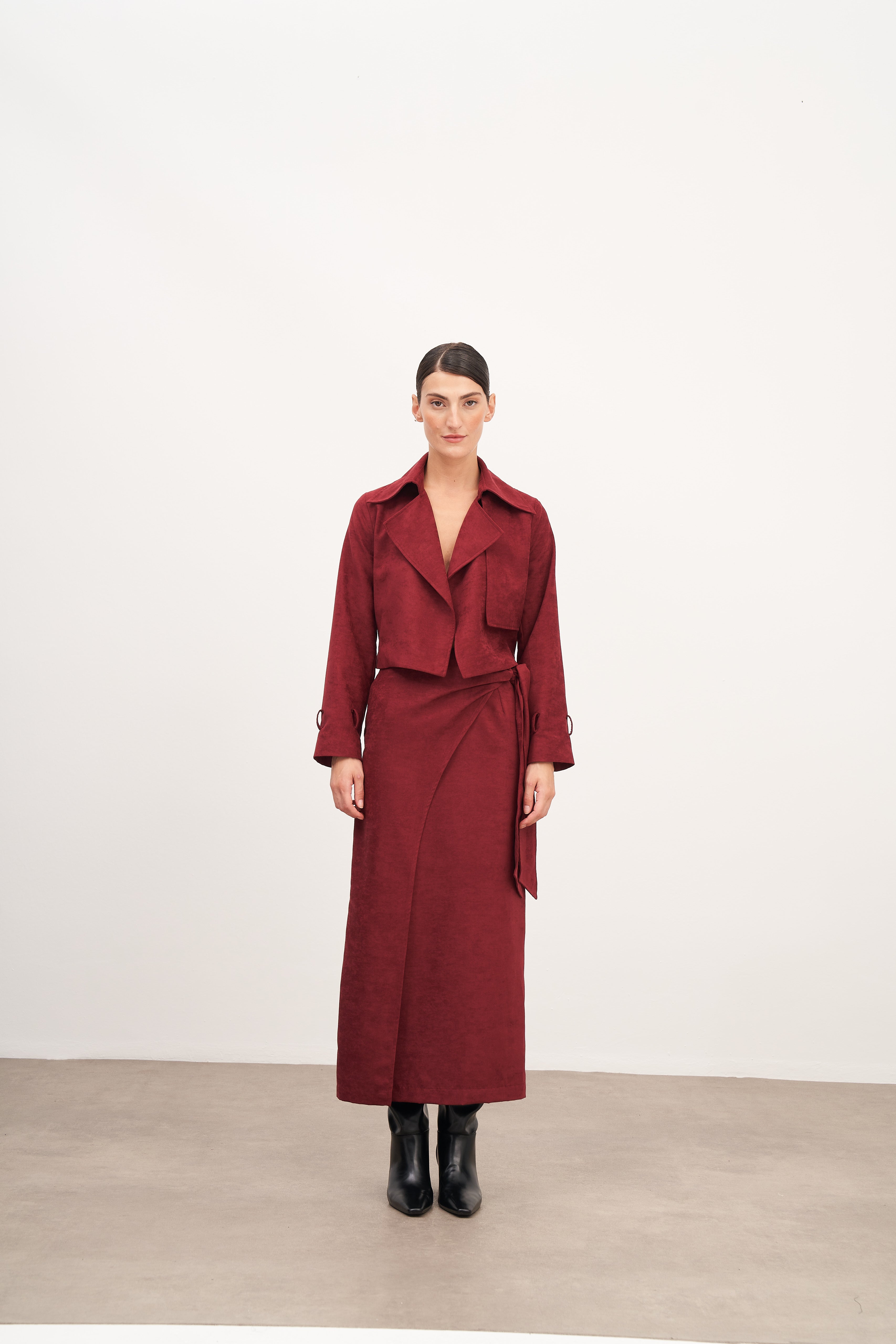 WINGCOTT Bordo Süet Bağlama Detaylı Uzun Etek
