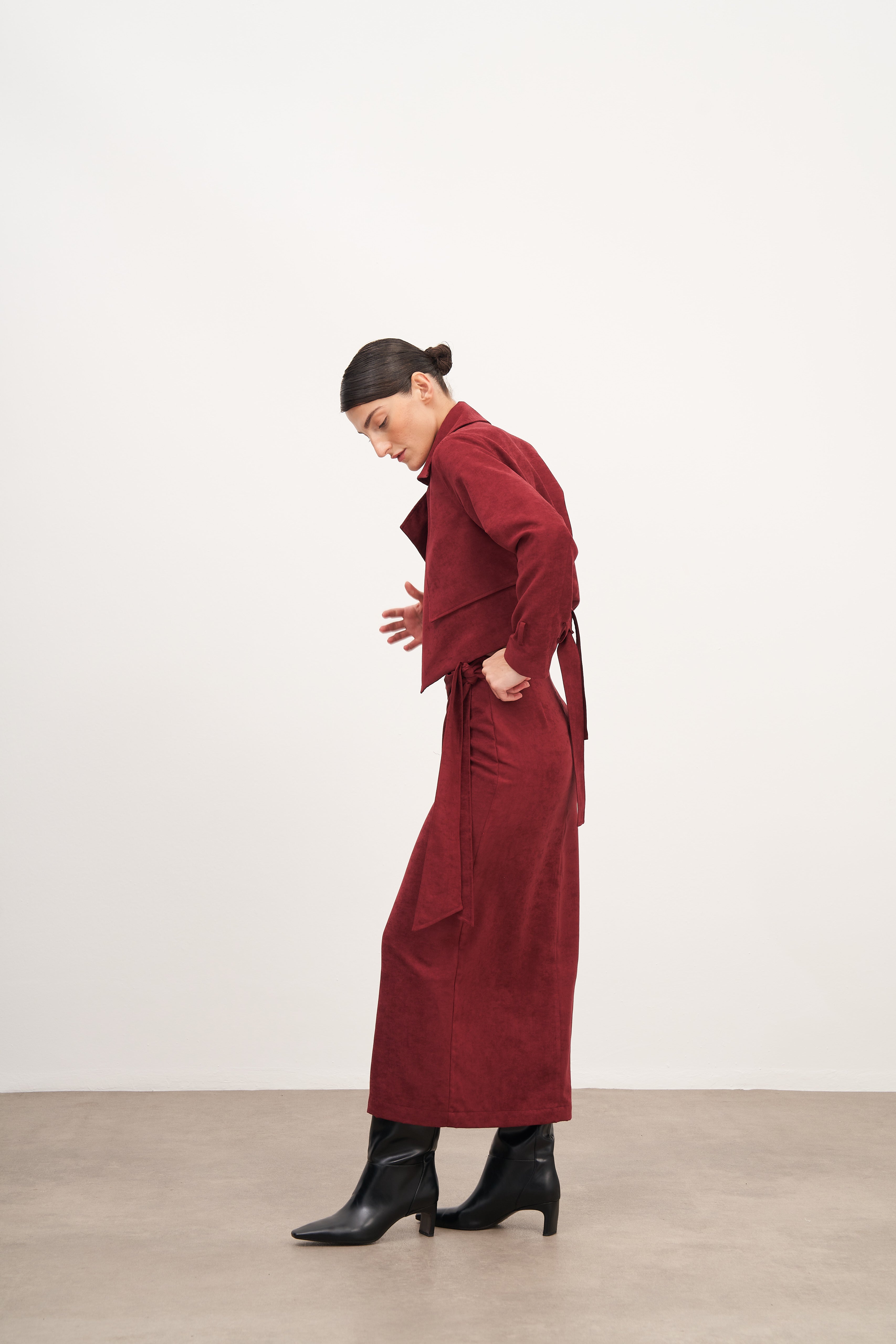 Bordo Süet Bağlama Detaylı Uzun Etek