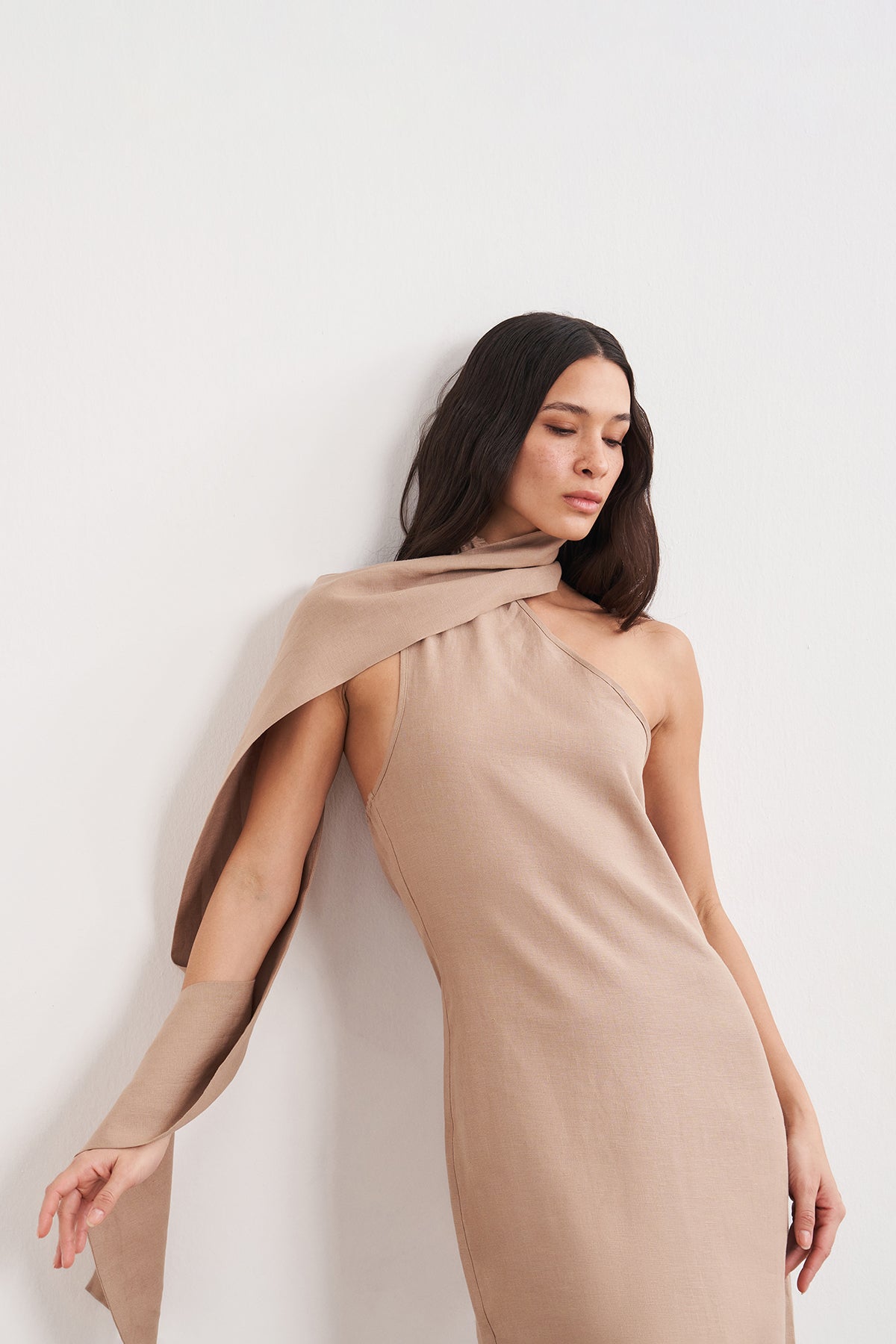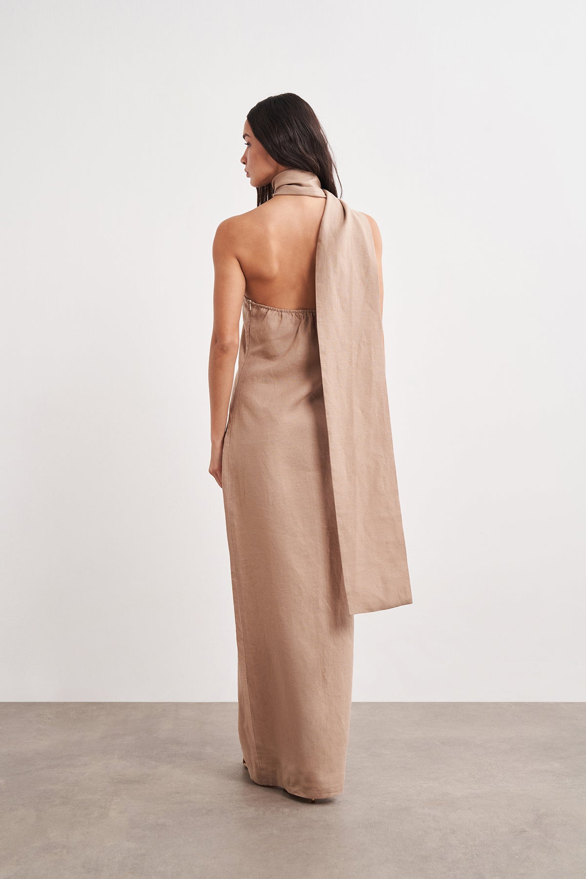 Boyun Bağlama Detaylı Maxi Keten Elbise
