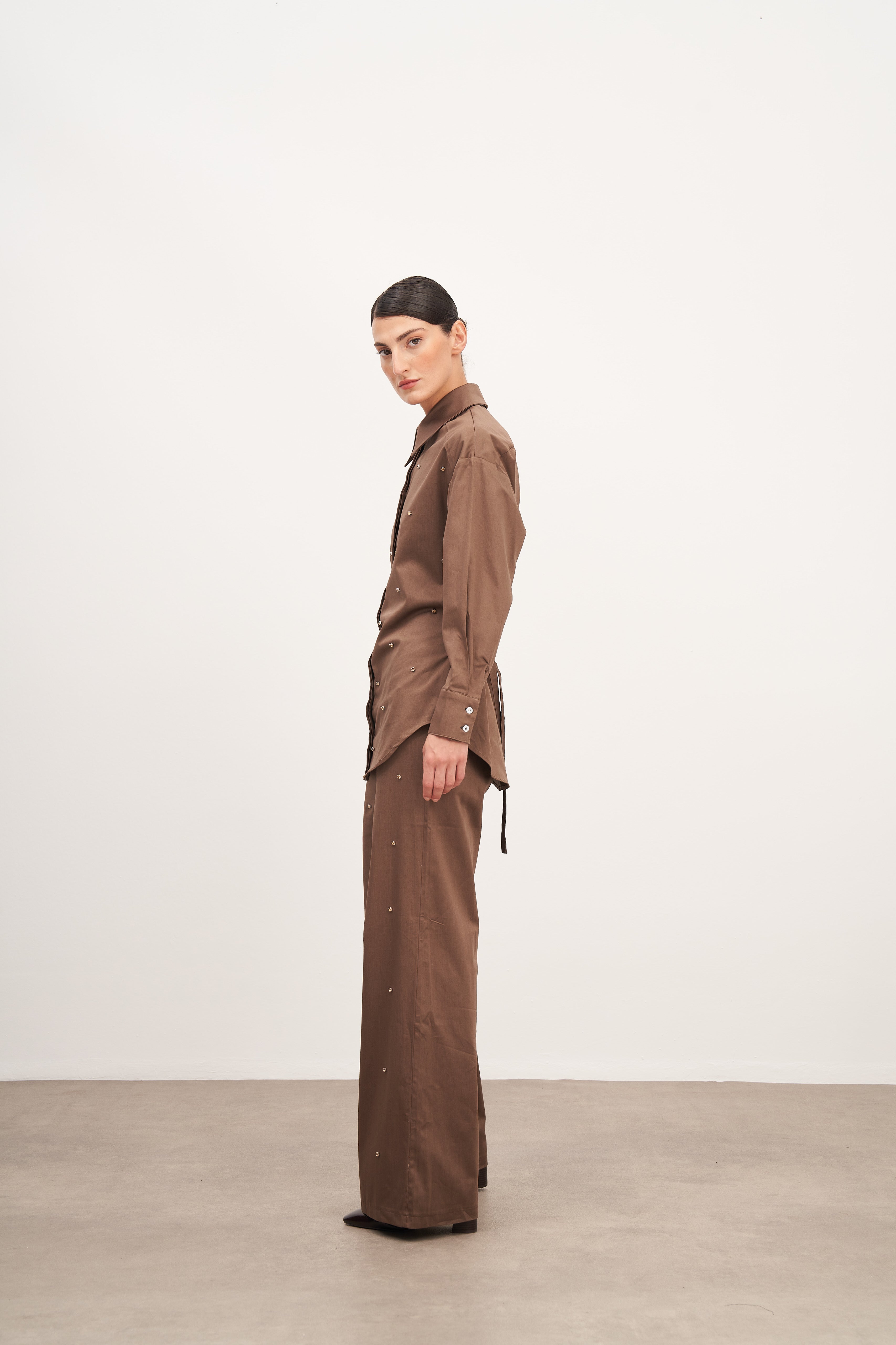 WINGCOTT Kahverengi Taş İşlemeli Rahat Pantolon
