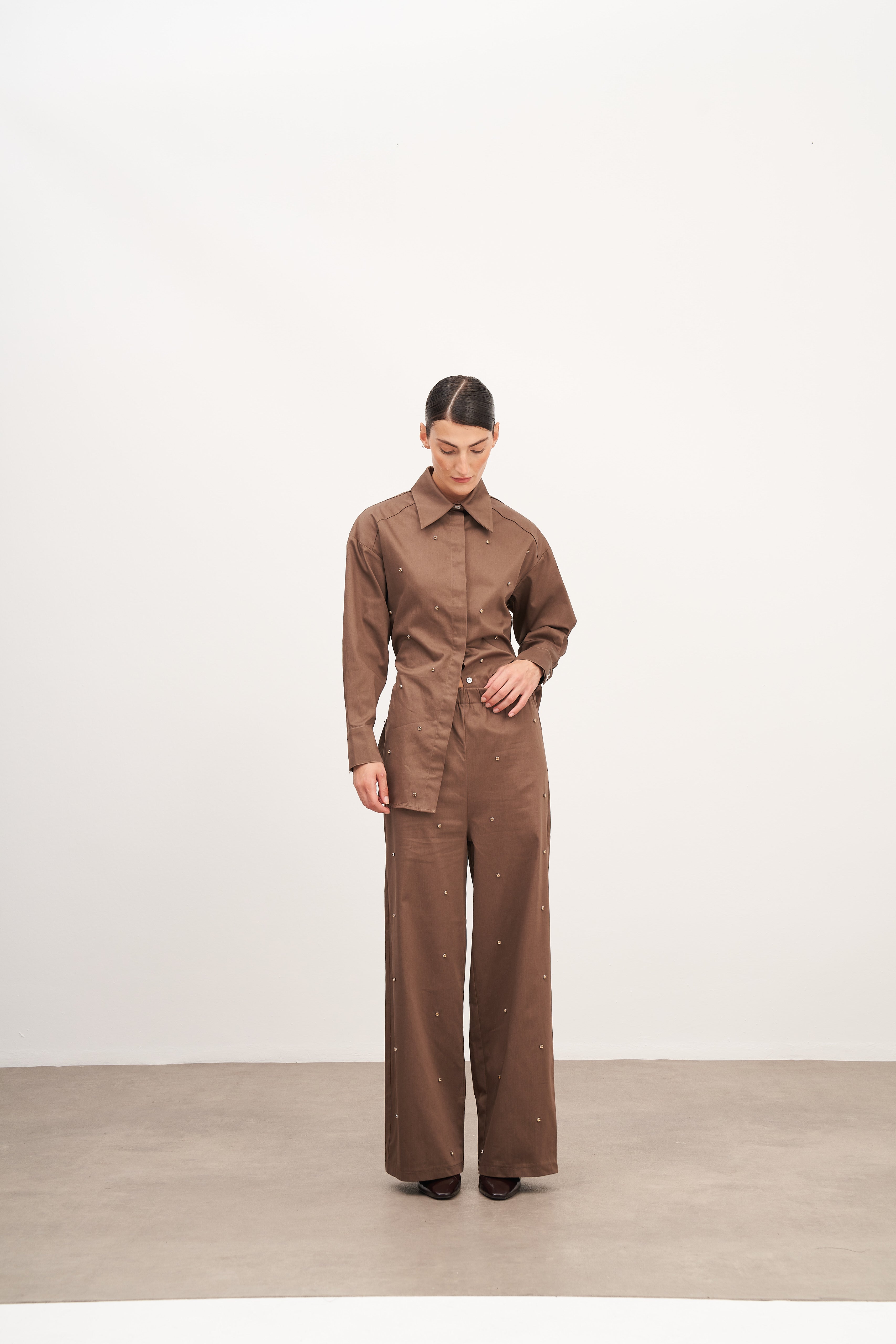 Kahverengi Taş İşlemeli Rahat Pantolon
