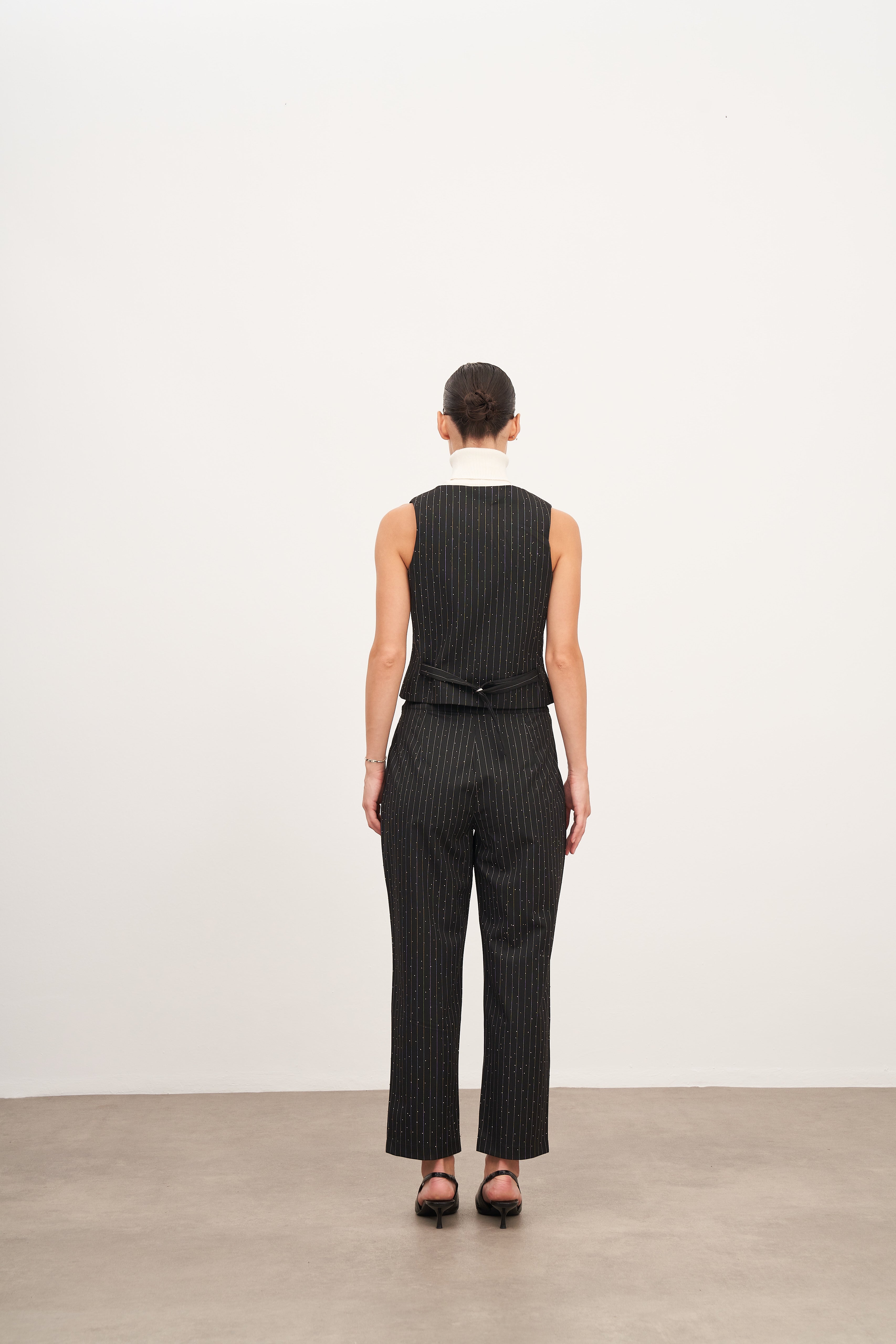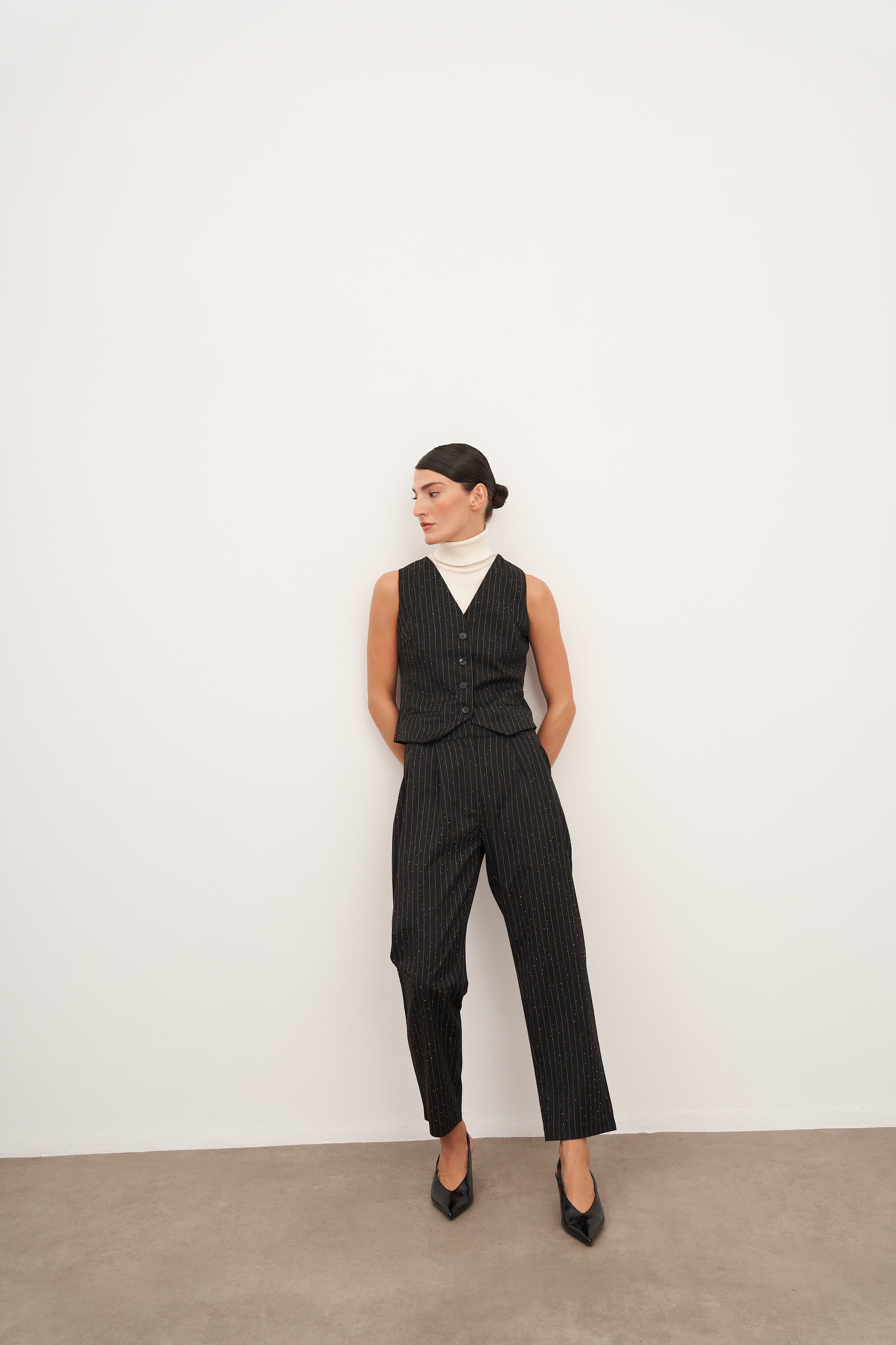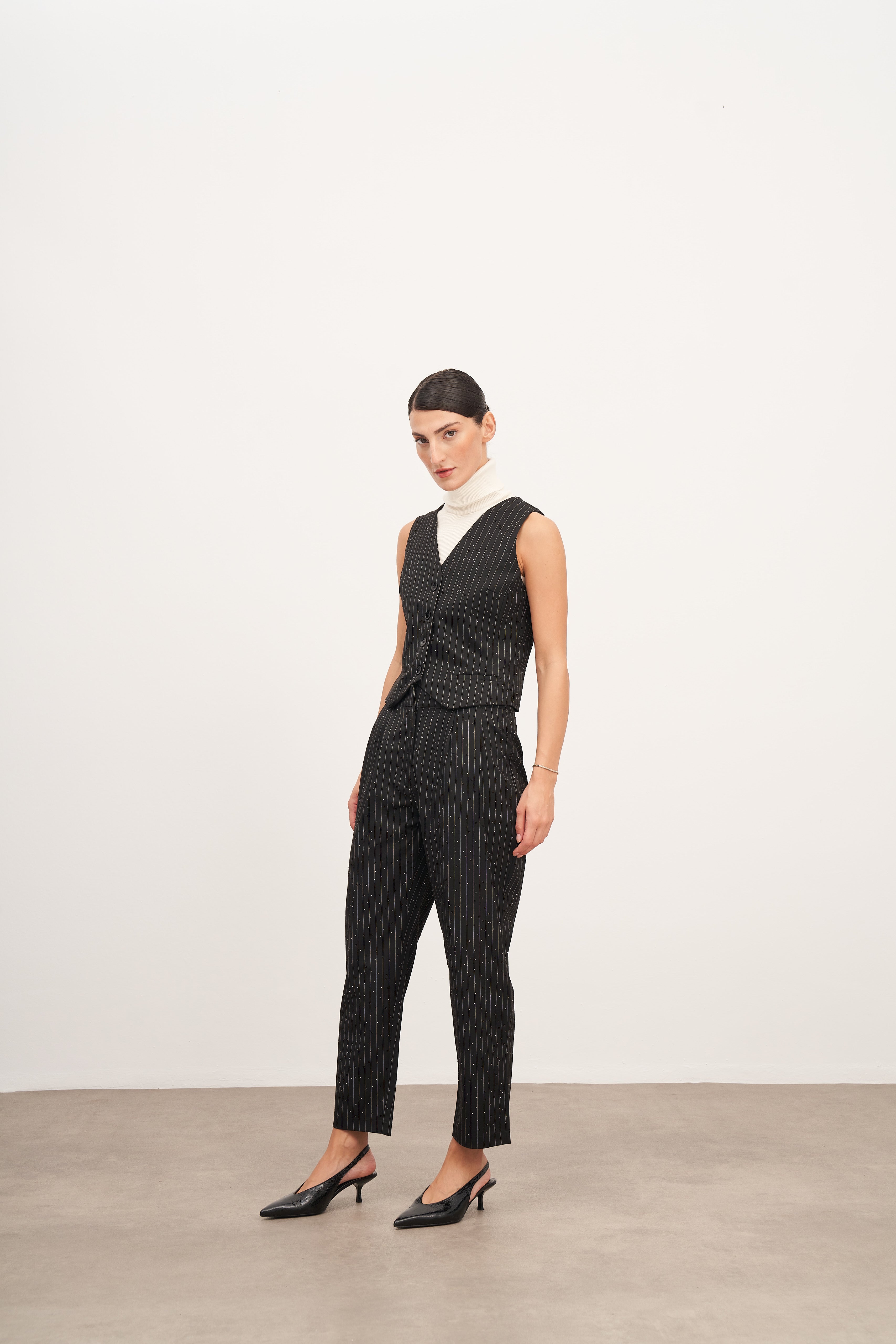 Siyah Çift Pileli Hotfix Havuç Kesim Pantolon