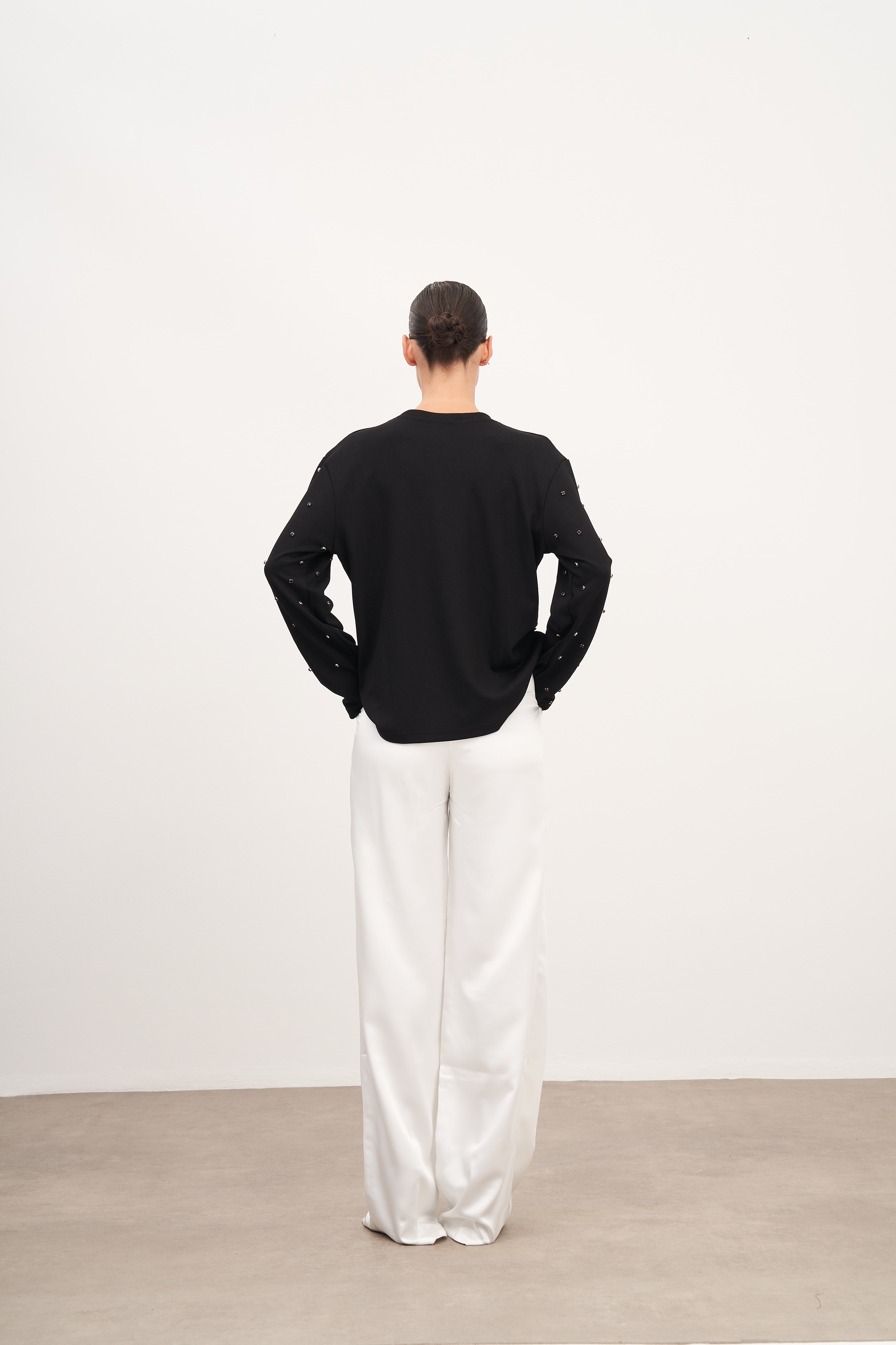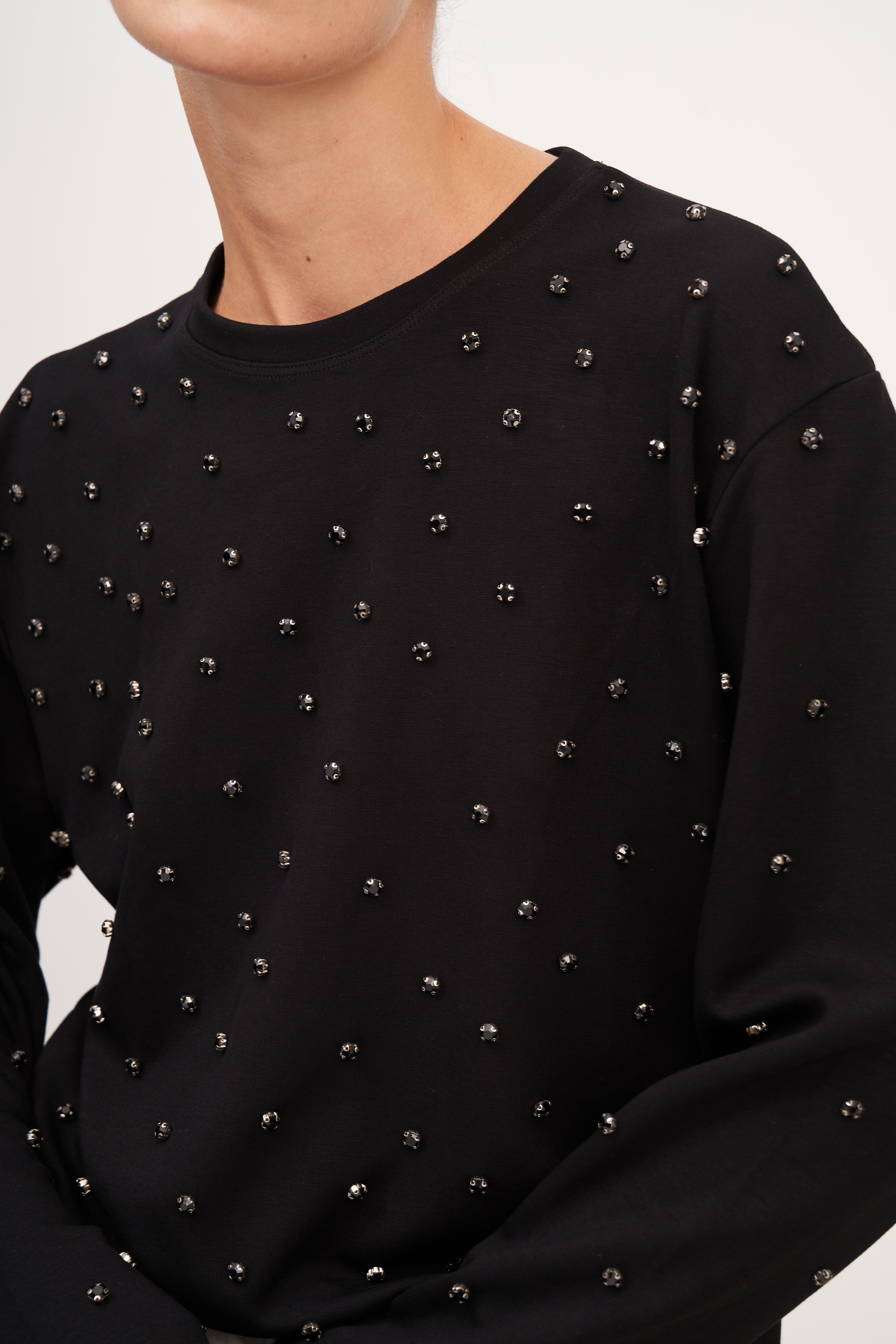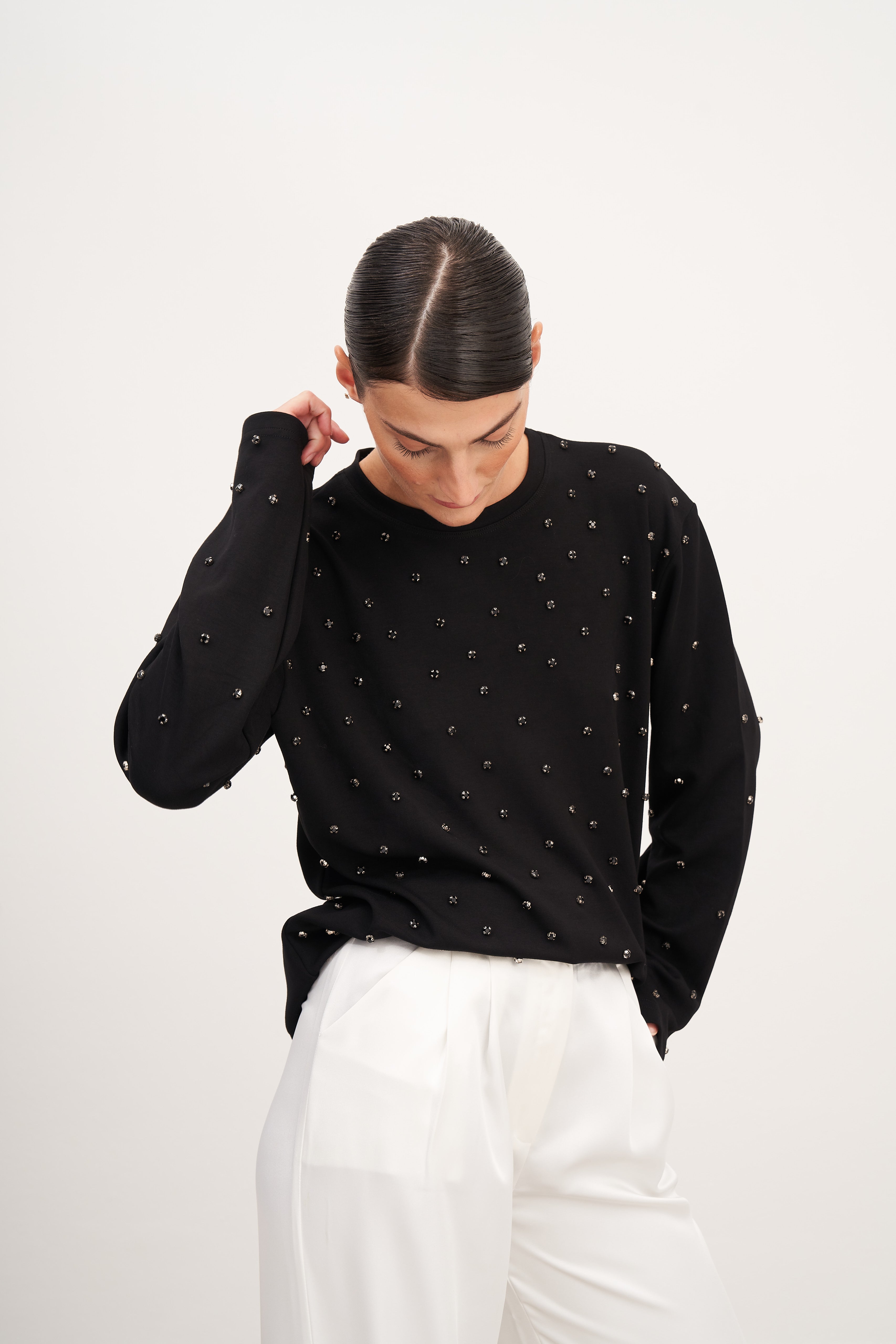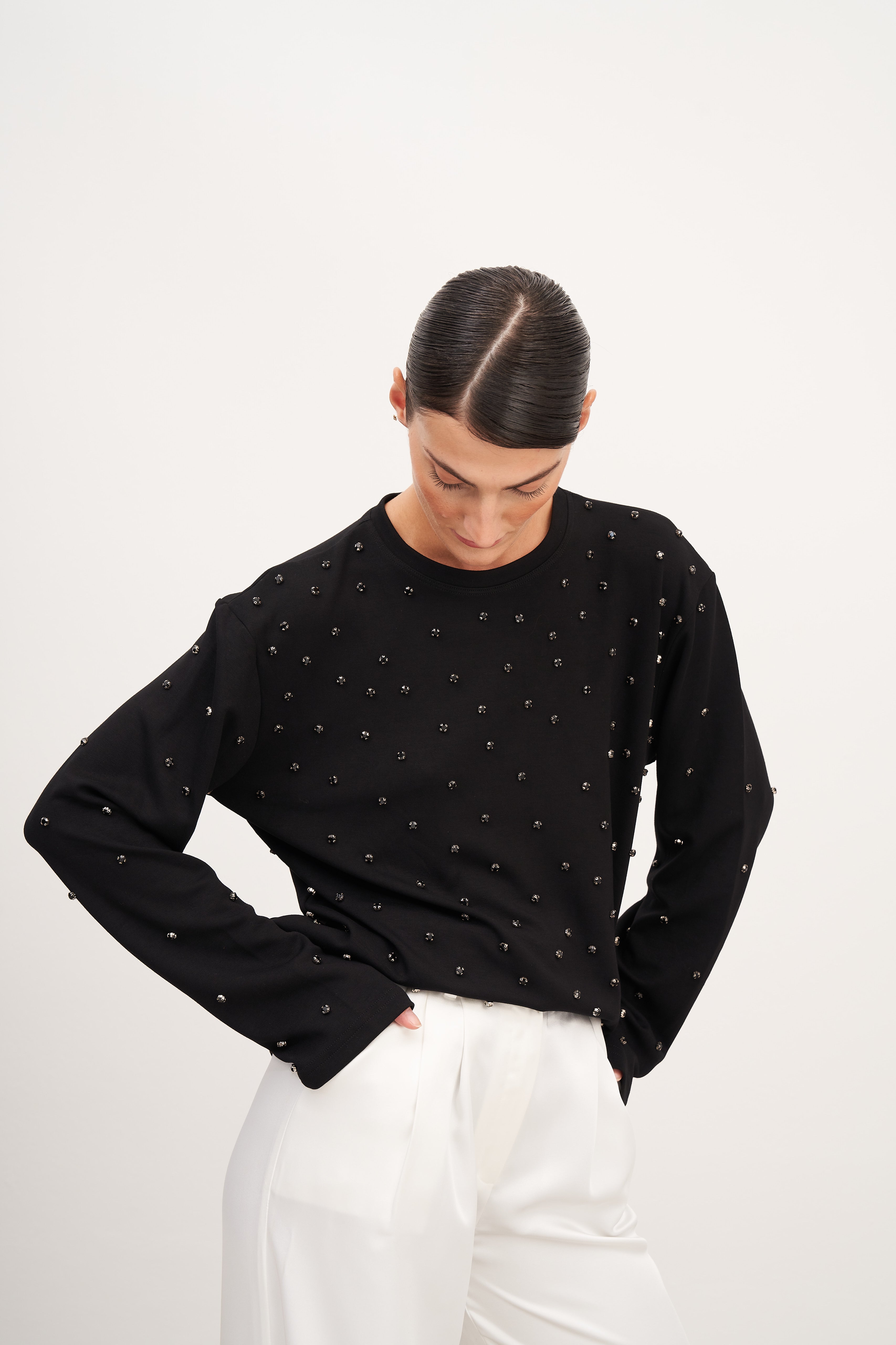 Siyah Taş işlemeli Vatkalı Uzun Kollu Tişört