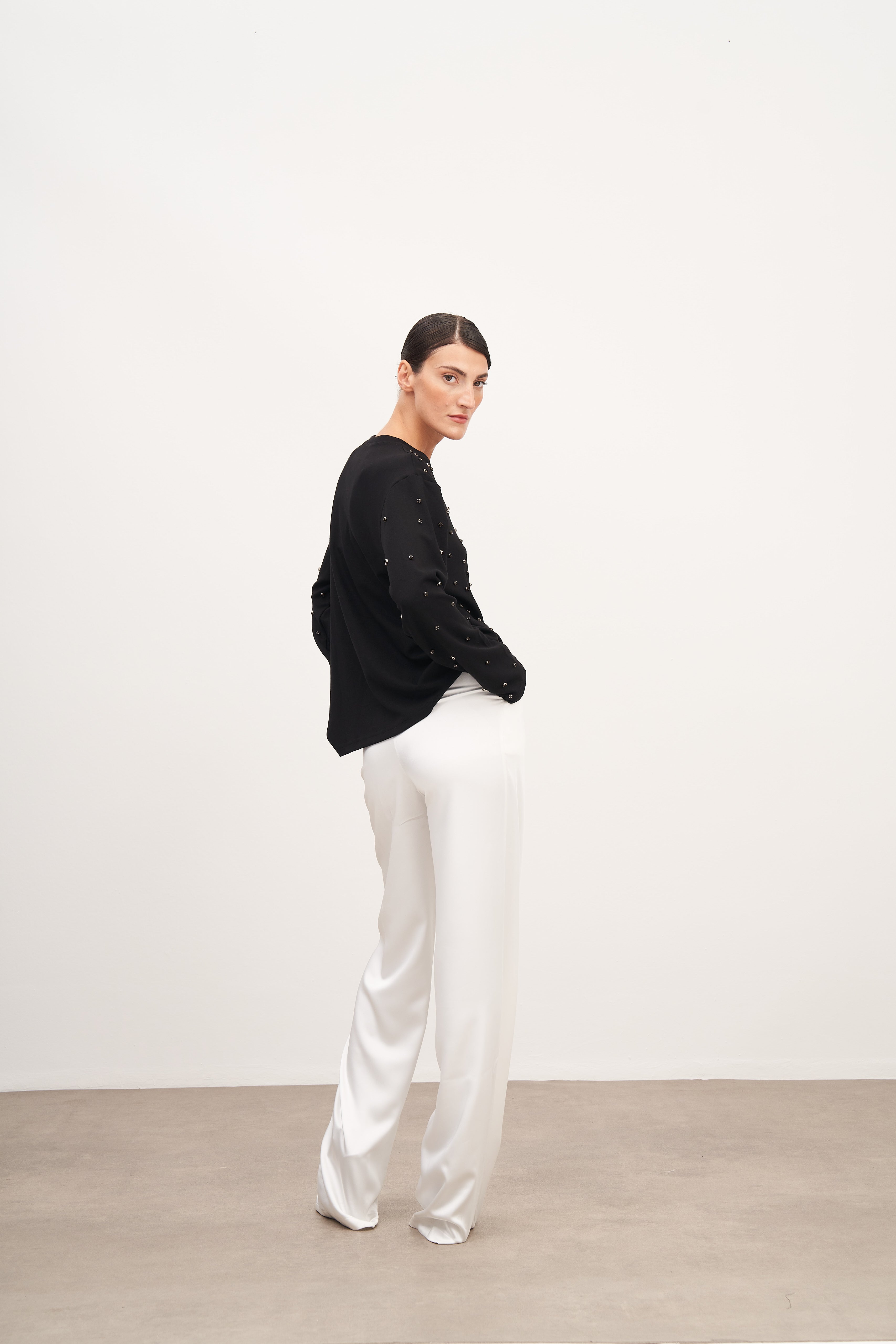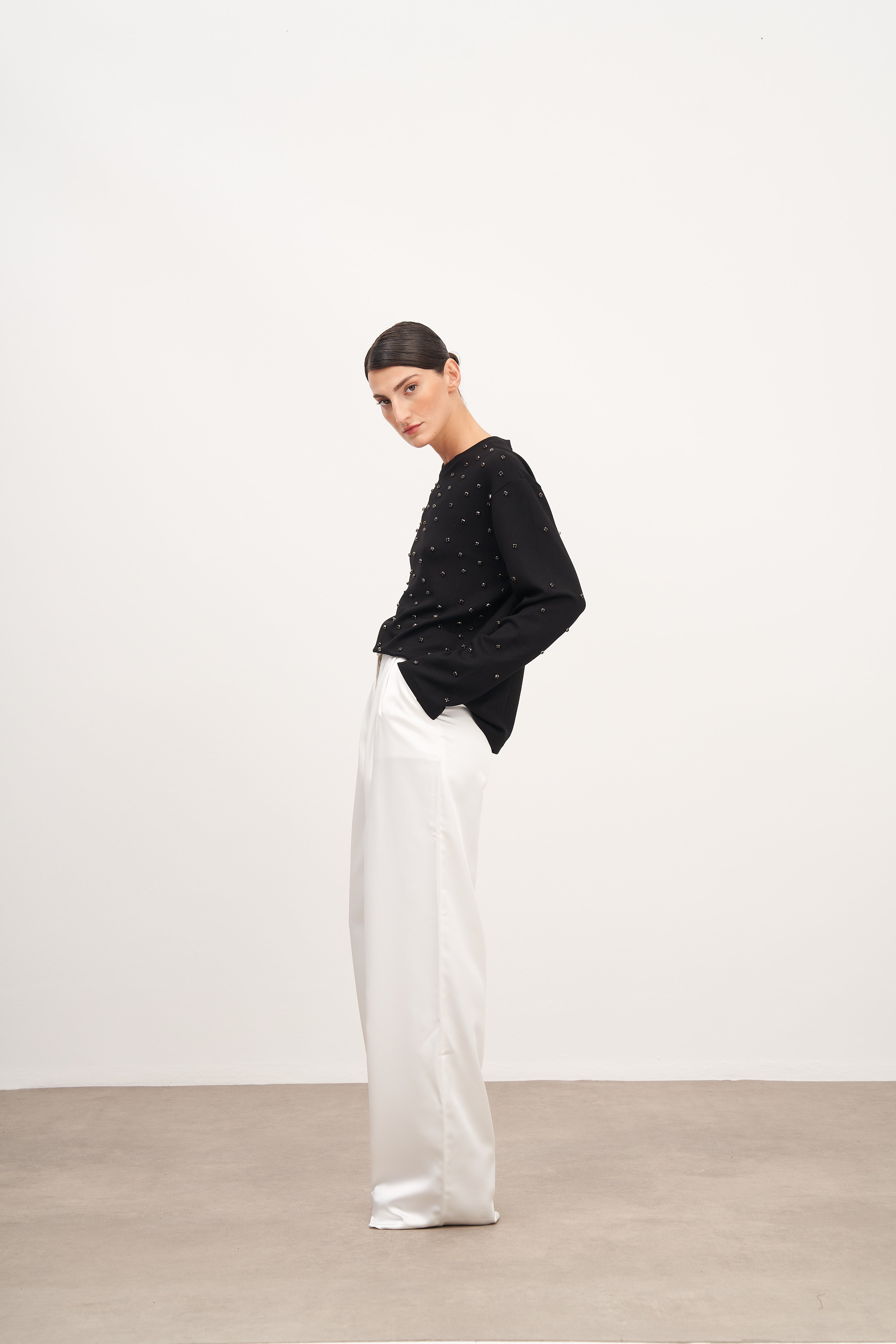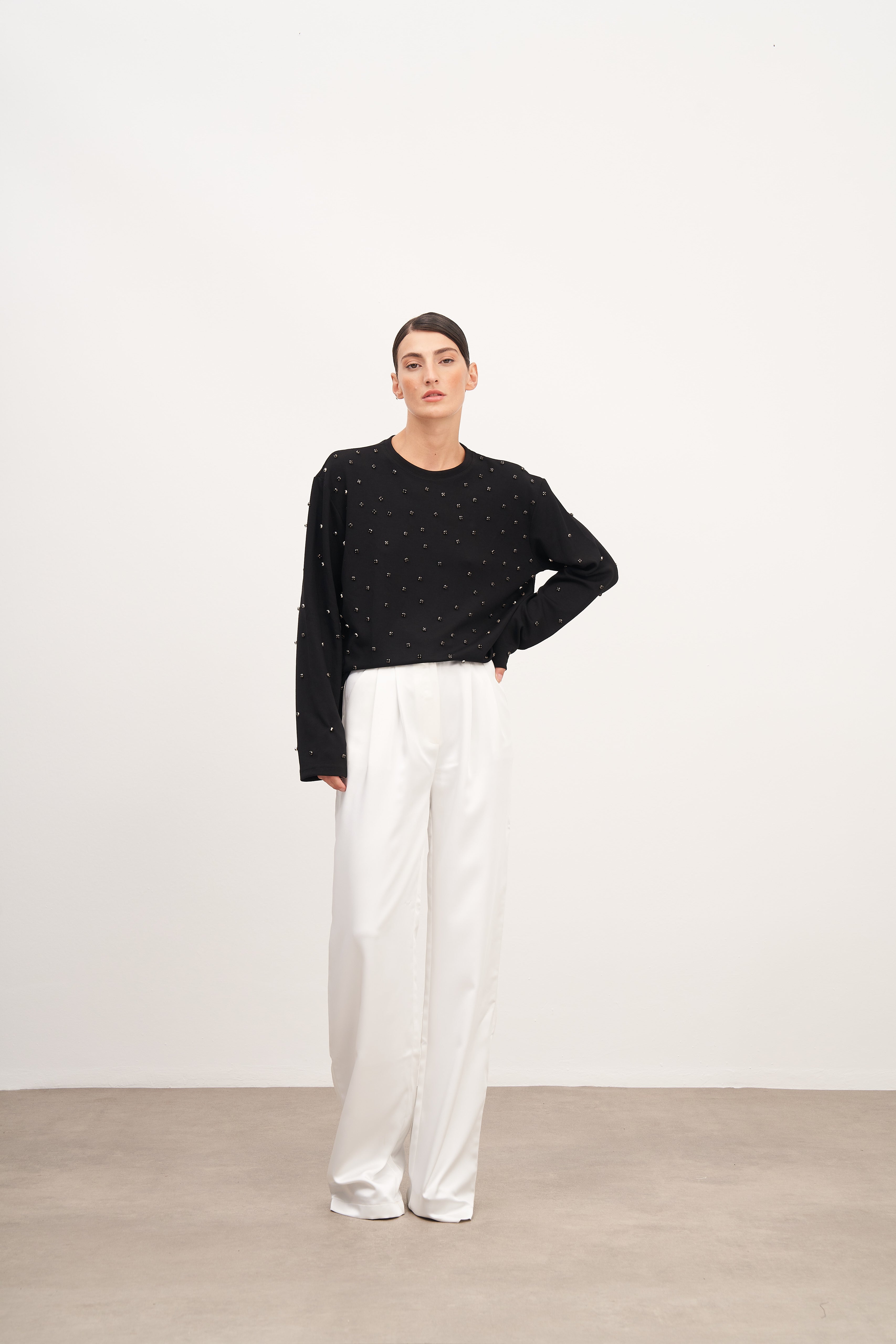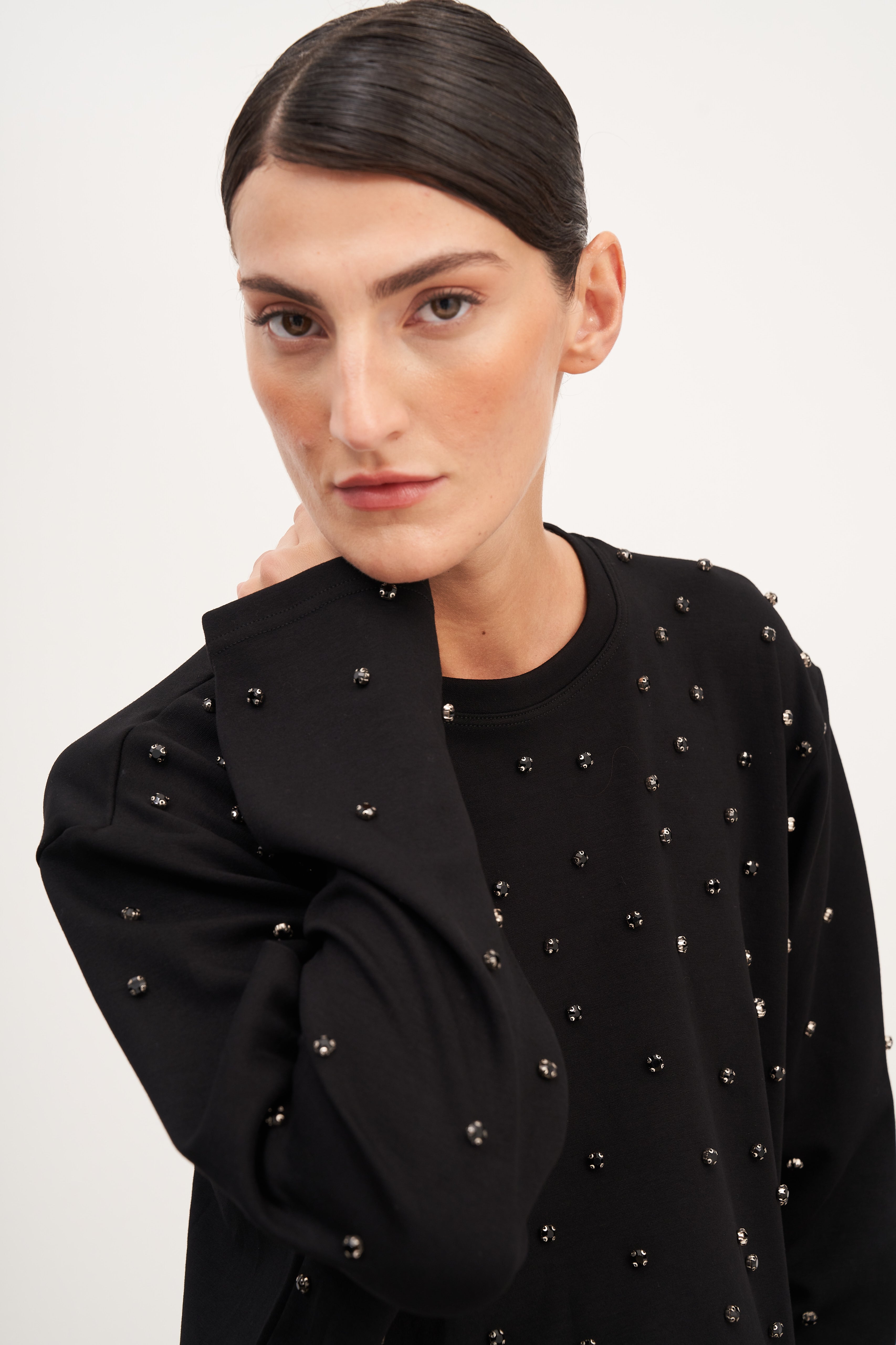 Siyah Taş işlemeli Vatkalı Uzun Kollu Tişört