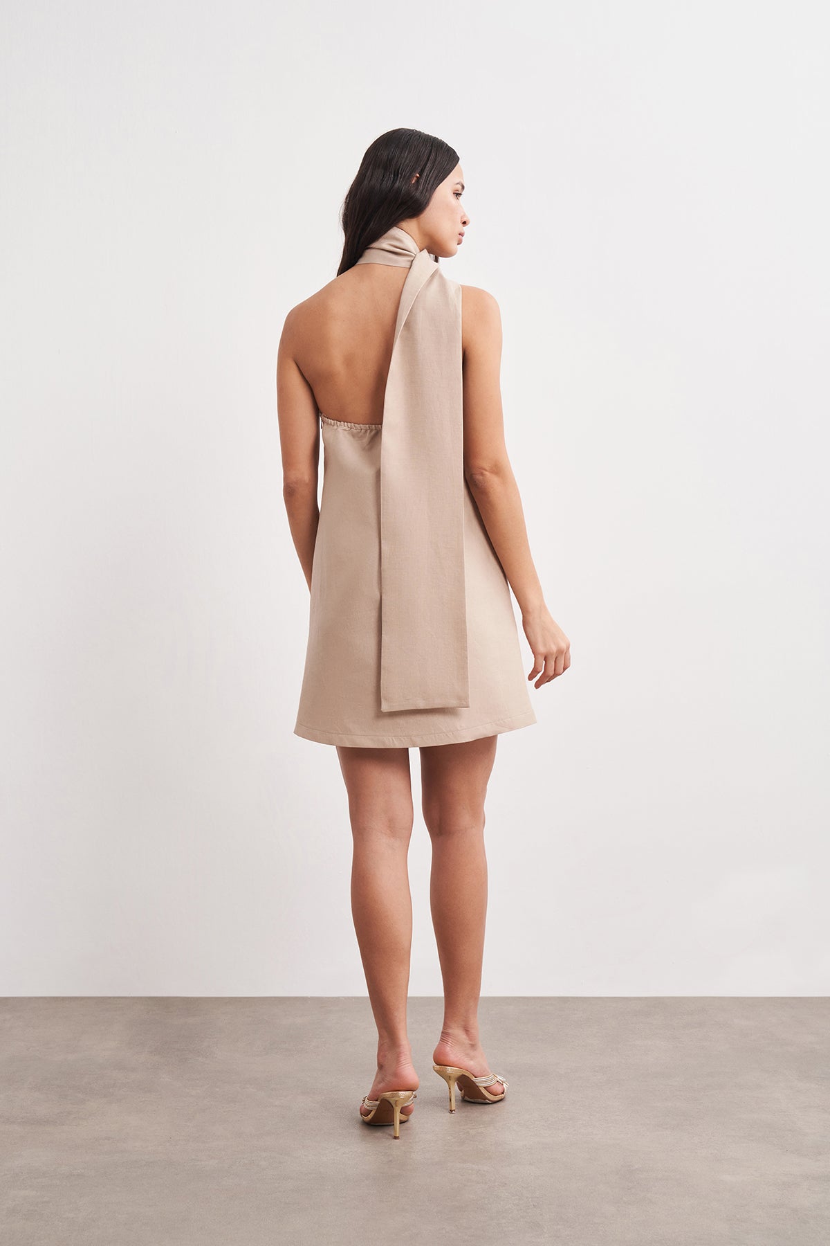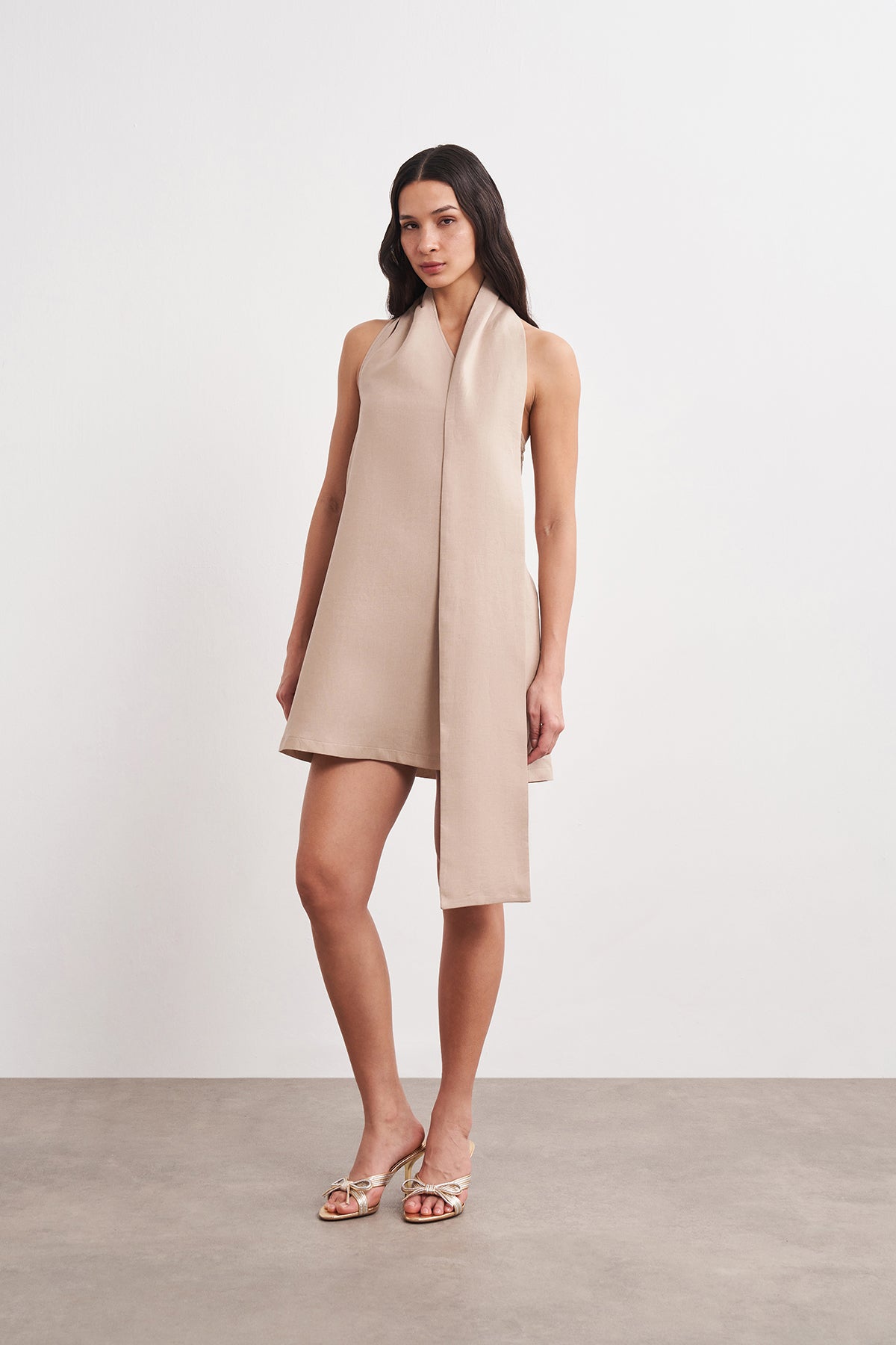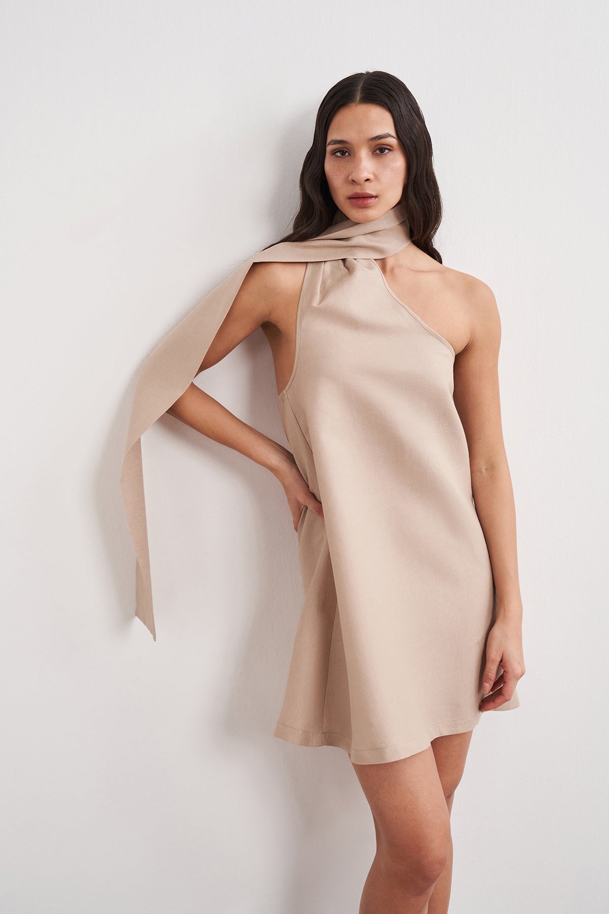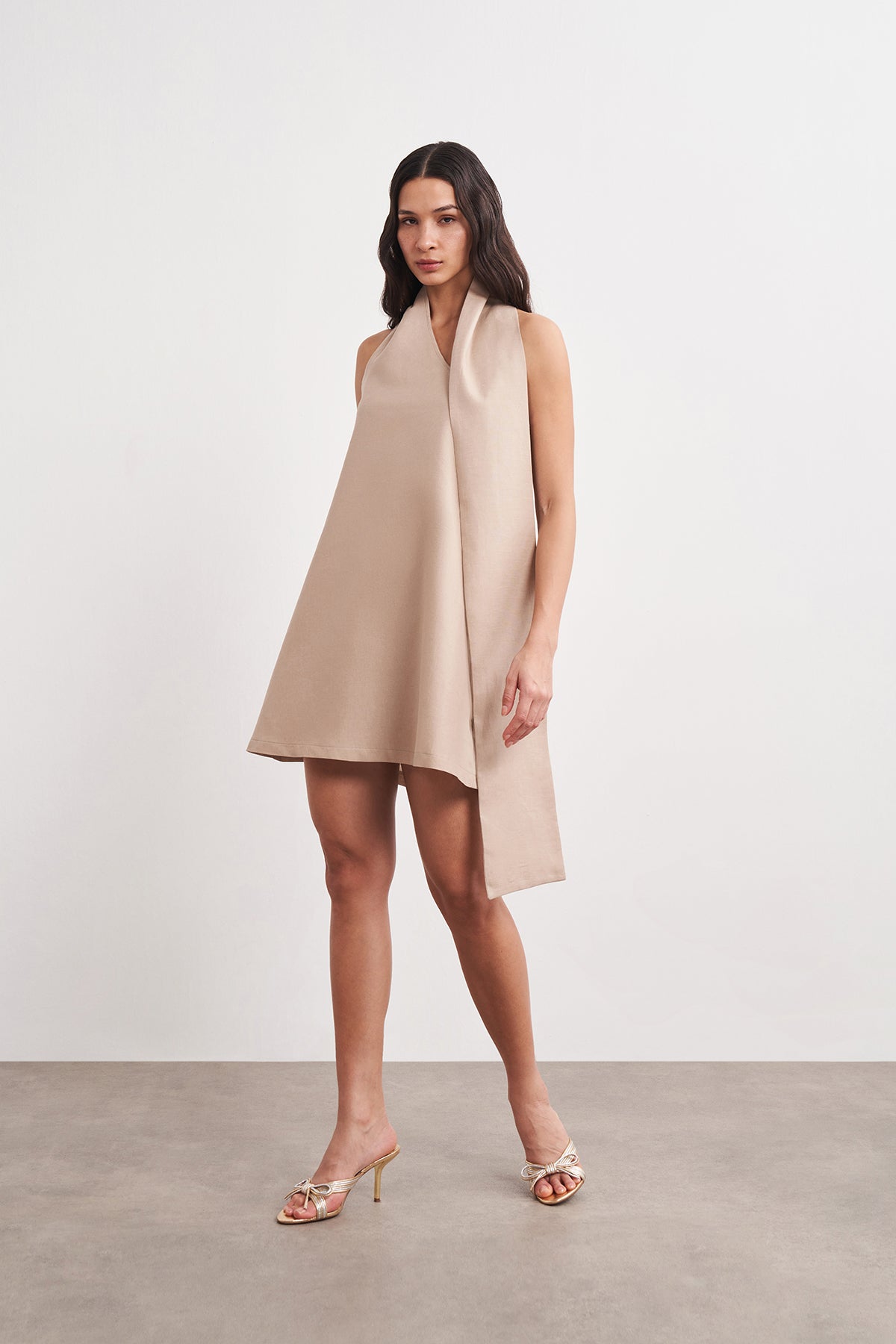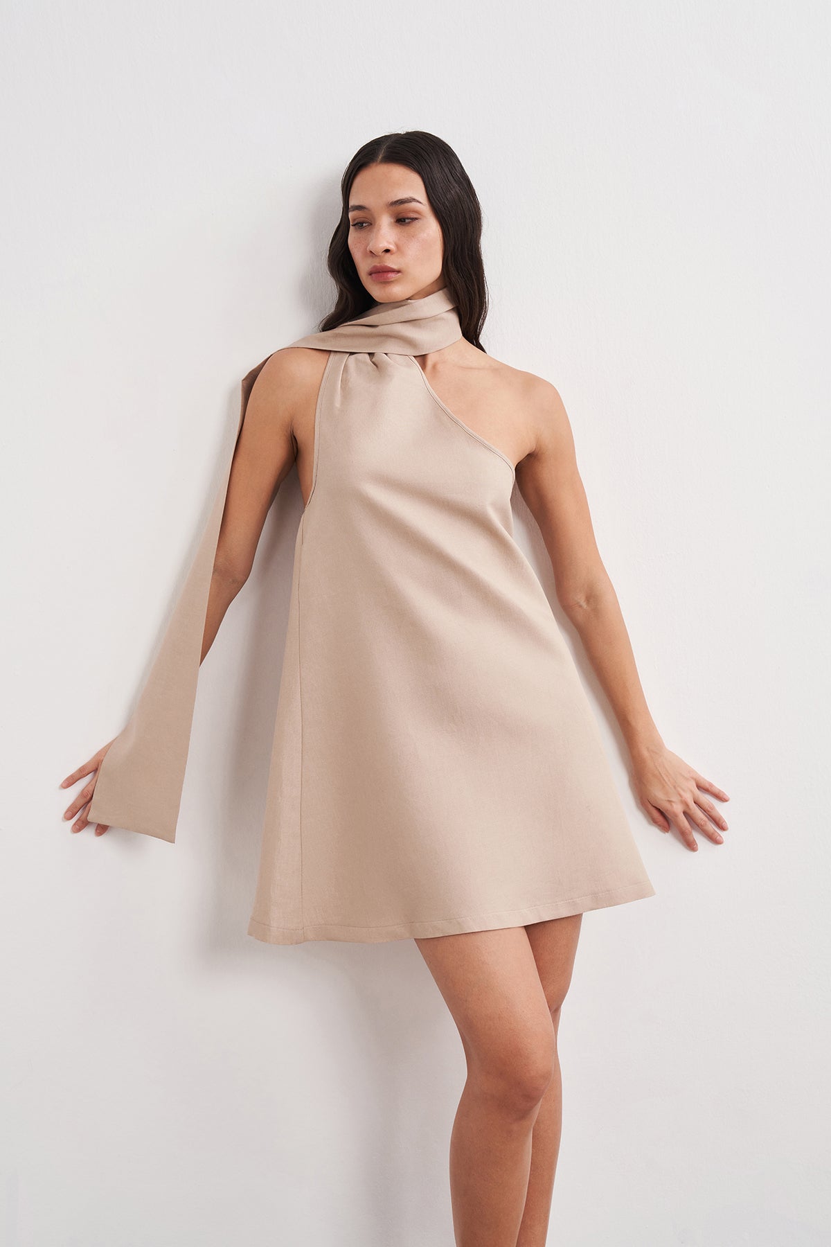 Tek Kol Boyun Detaylı Mini Keten Elbise