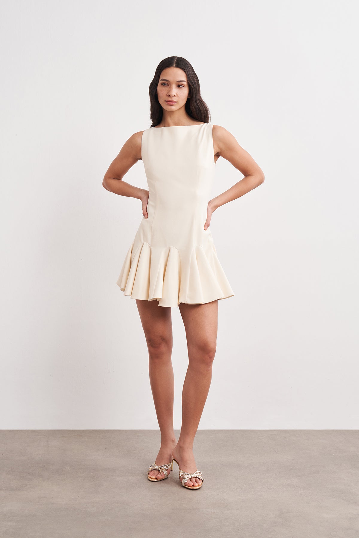 Volanlı Kayık Yaka Kolsuz Mini Elbise