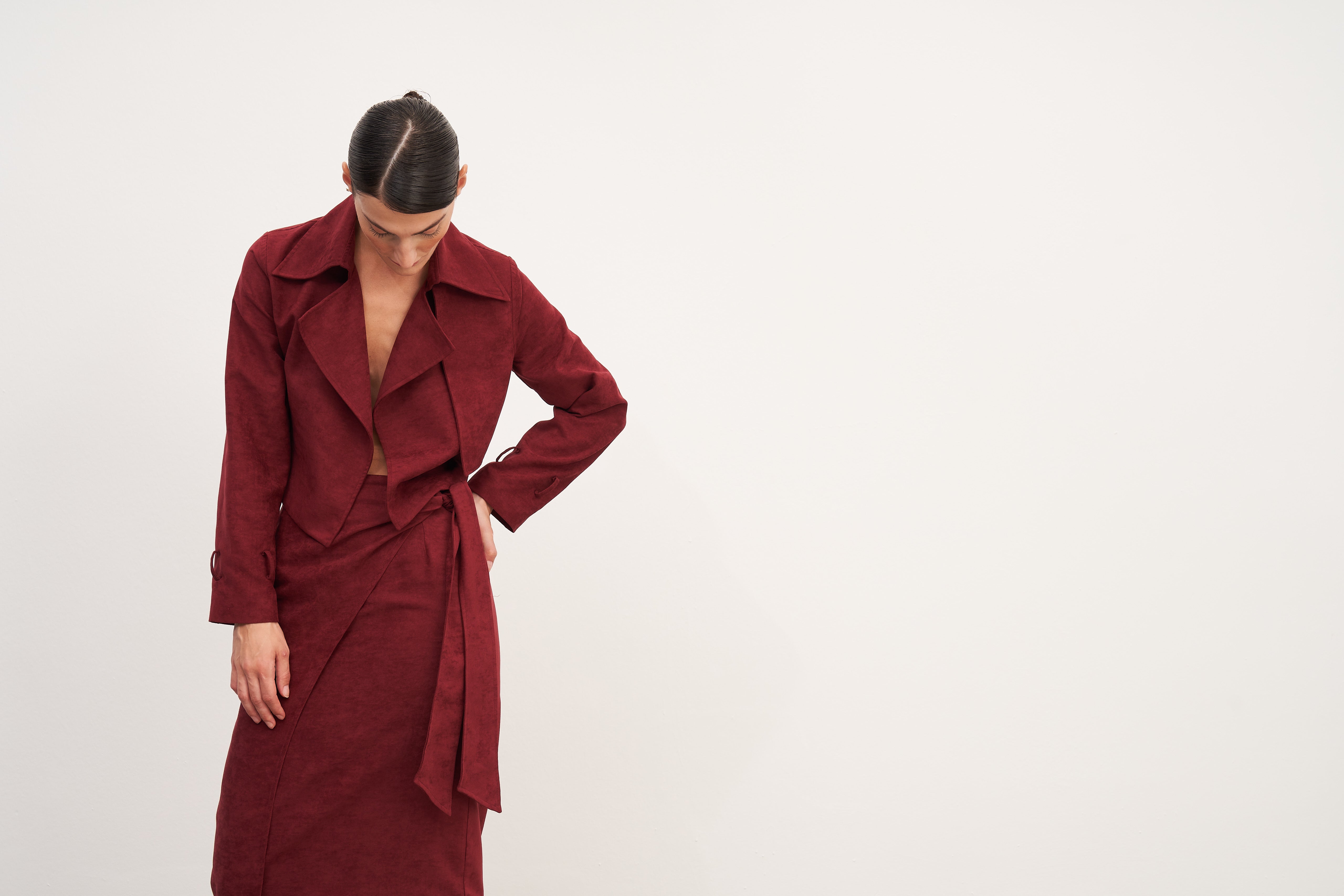 Bordo Süet Bağlama Detaylı Uzun Etek