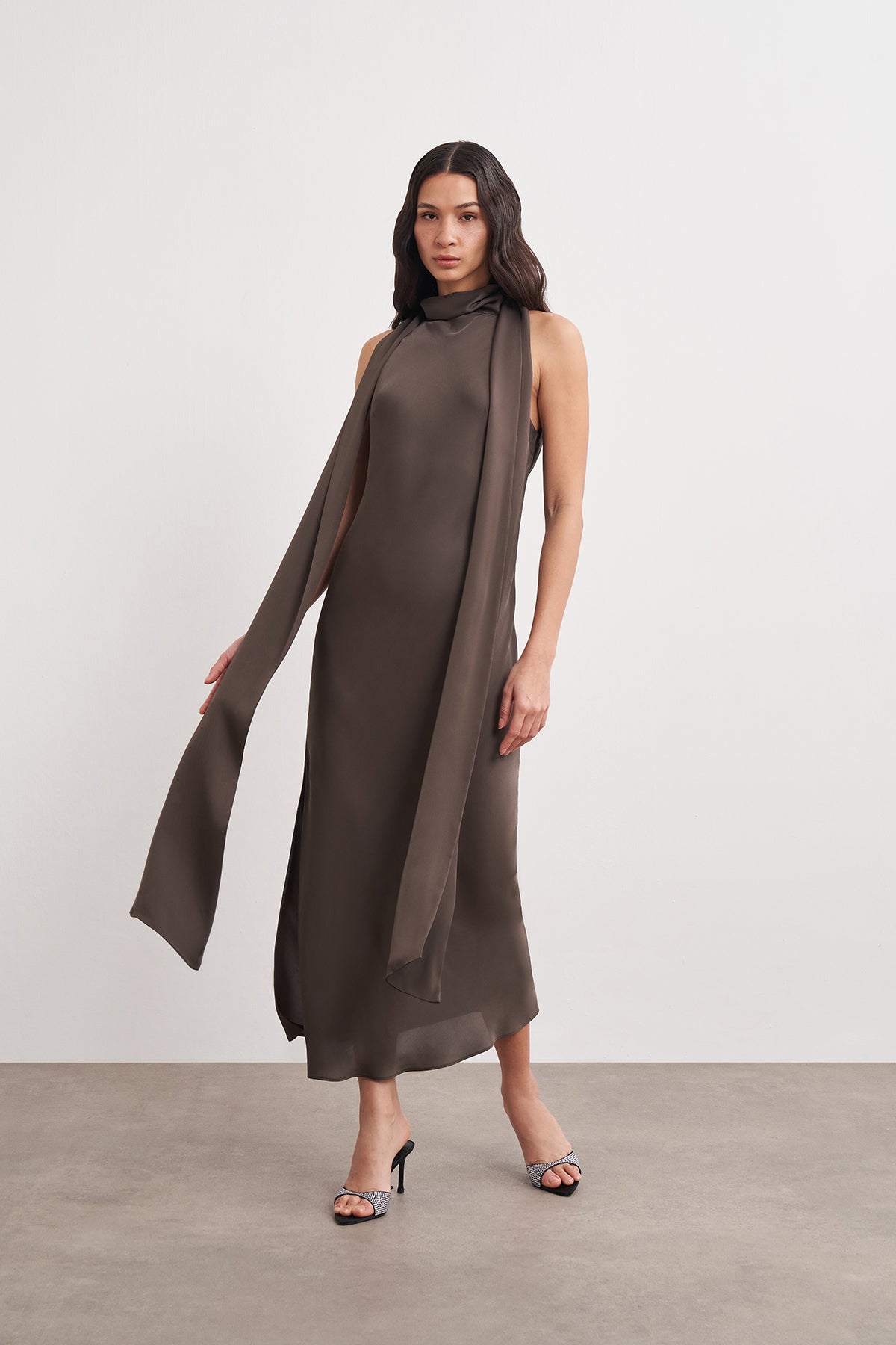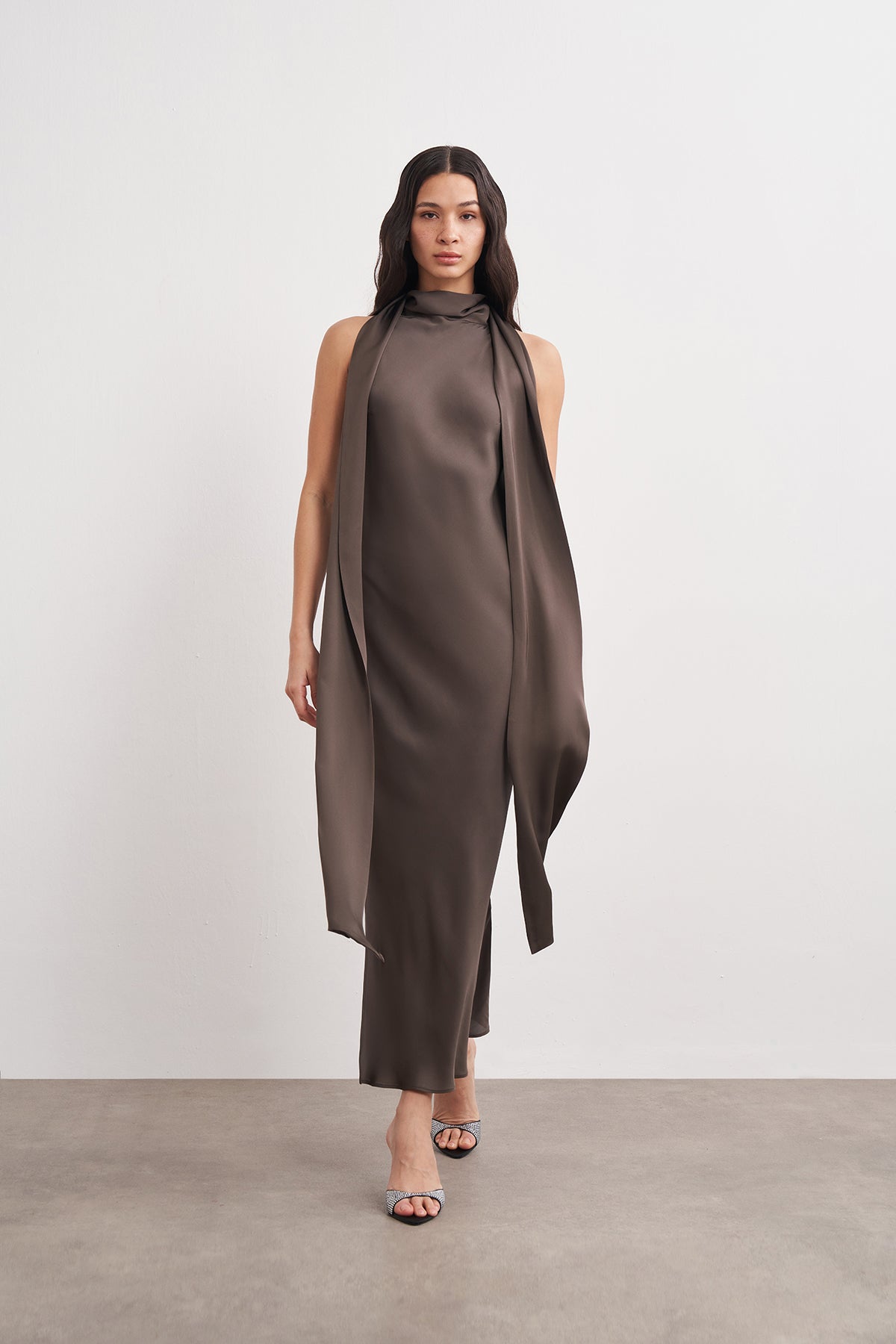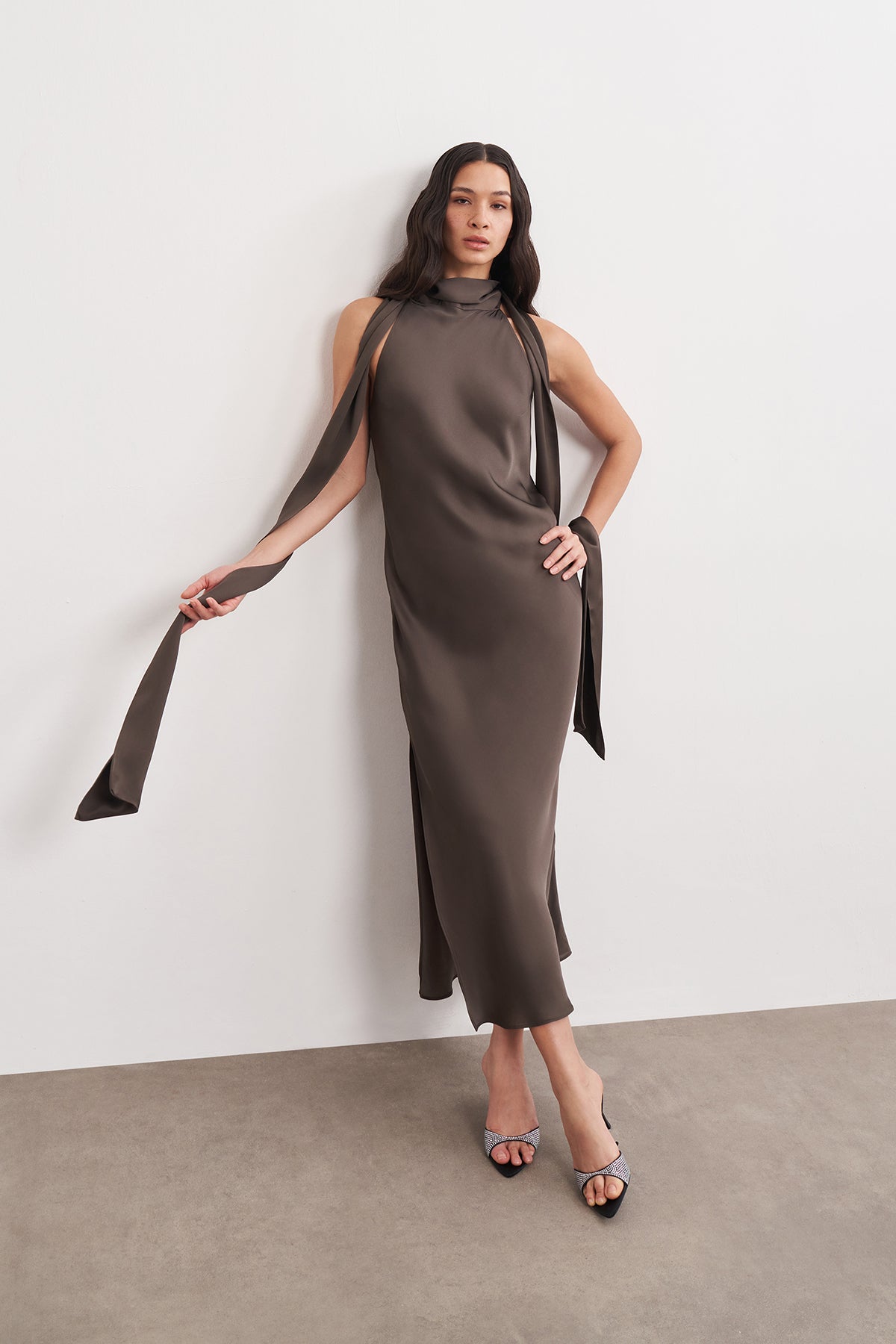 WINGCOTT Boyun ve Yırtmaç Detaylı Midi Saten Elbise
