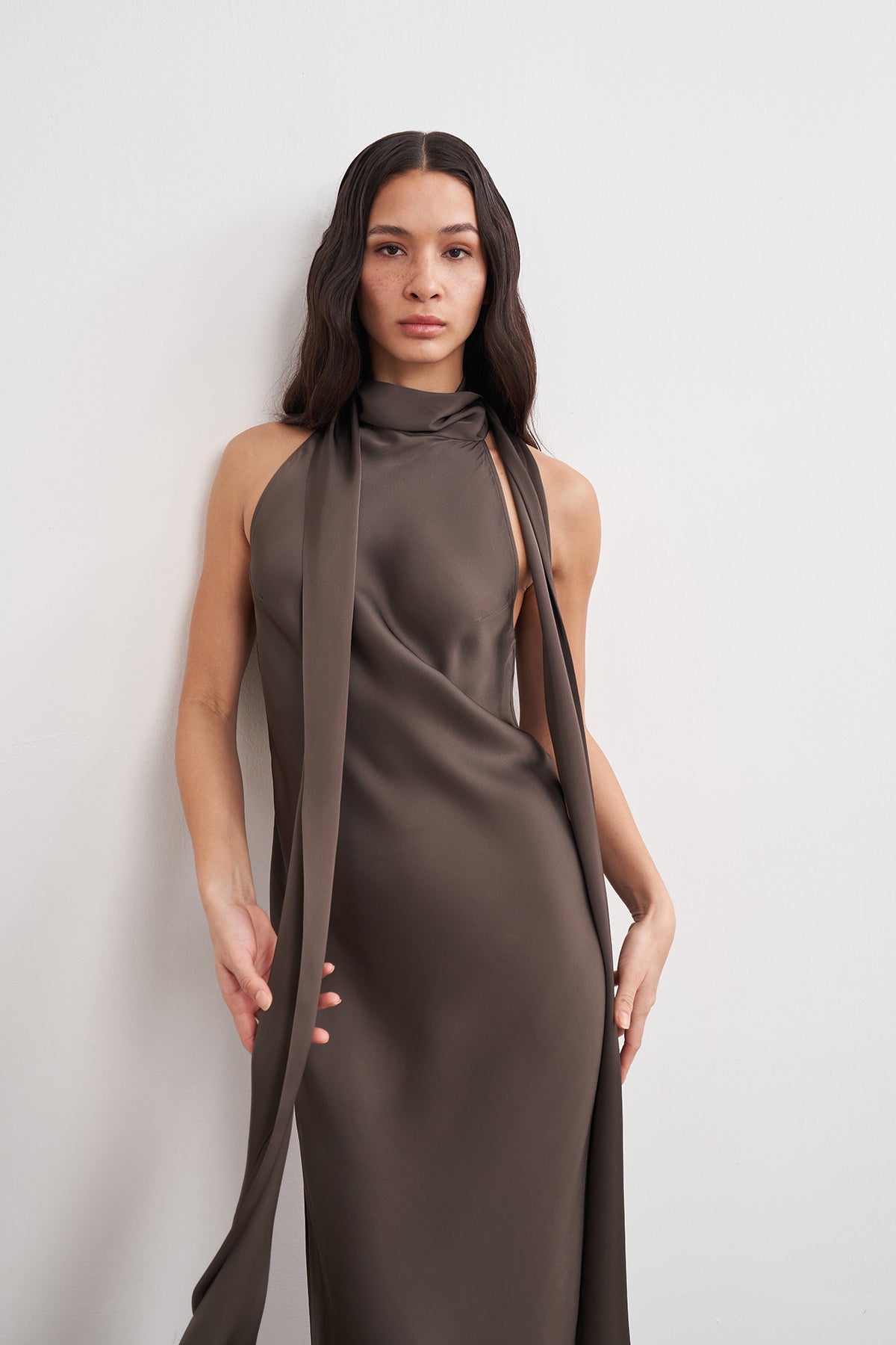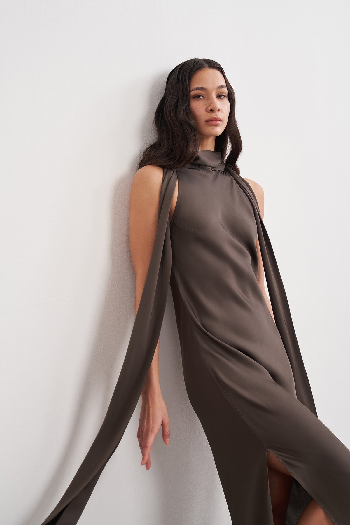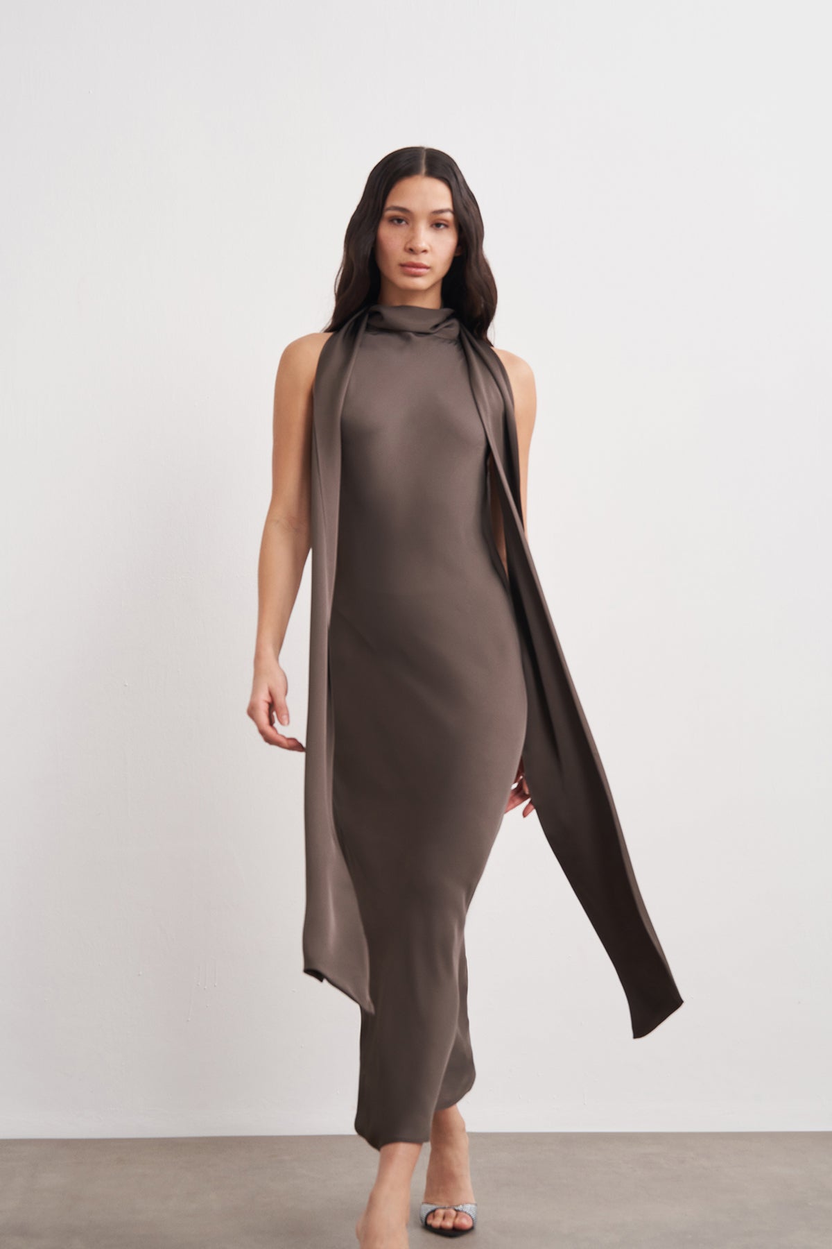 WINGCOTT Boyun ve Yırtmaç Detaylı Midi Saten Elbise