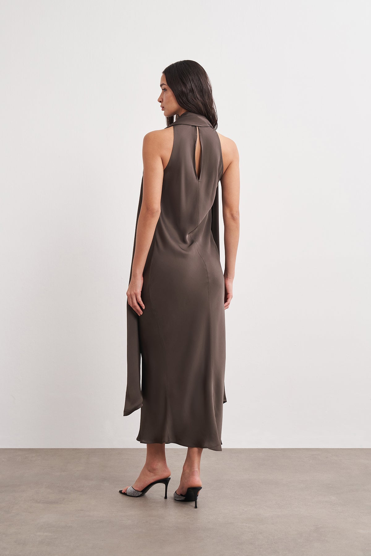 Boyun ve Yırtmaç Detaylı Midi Saten Elbise