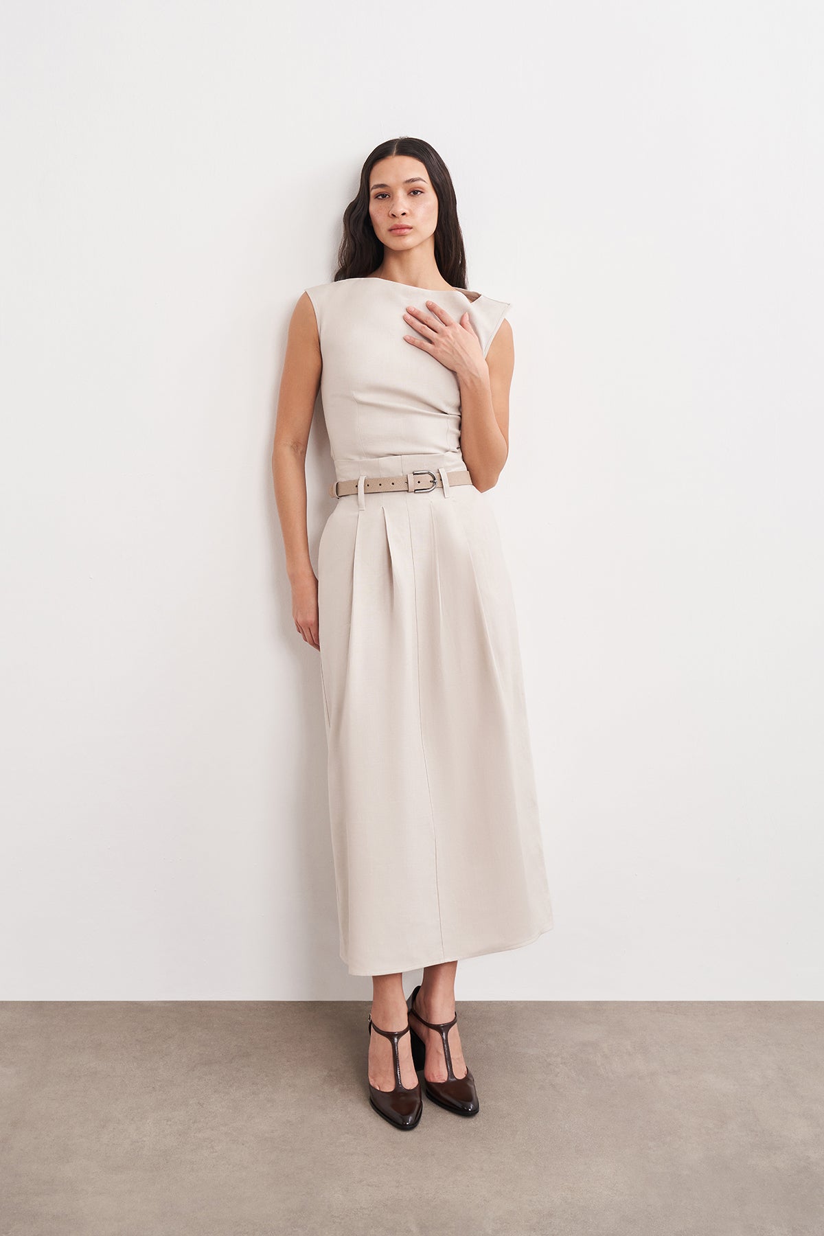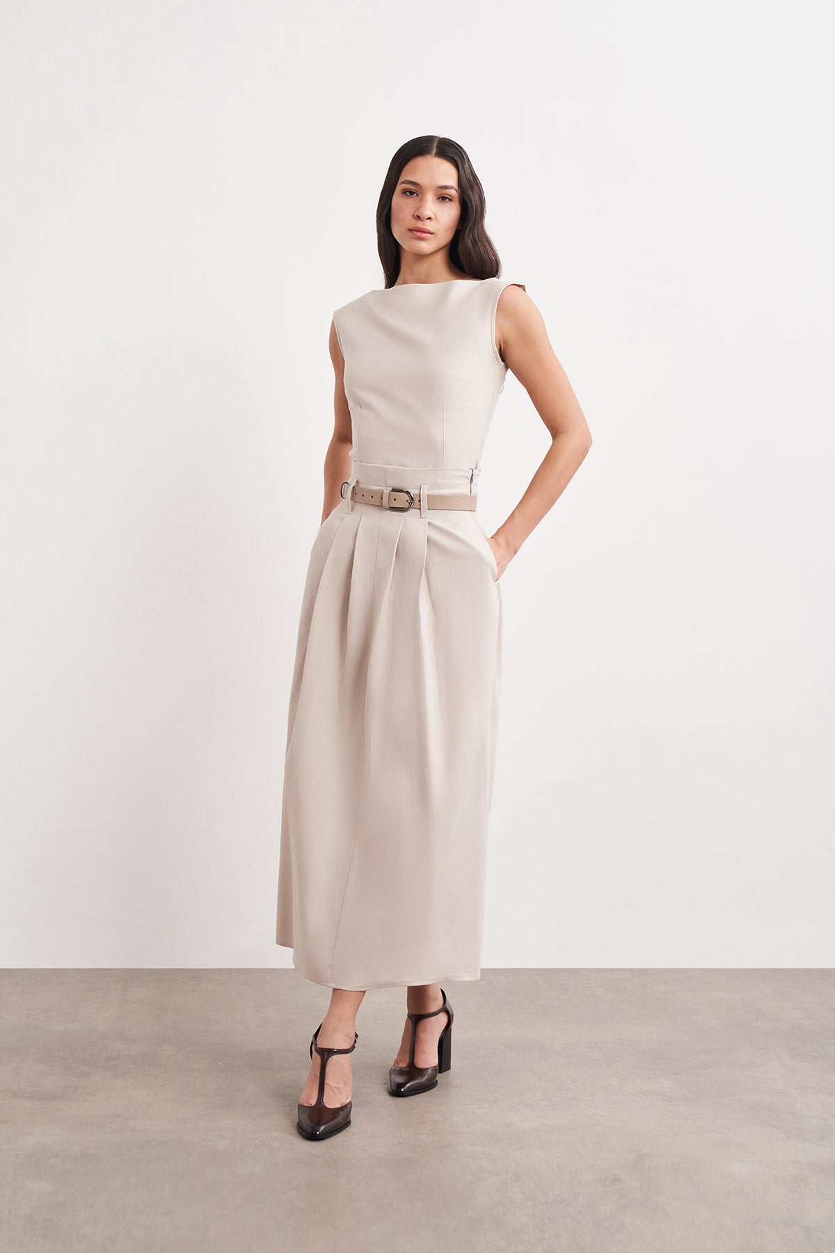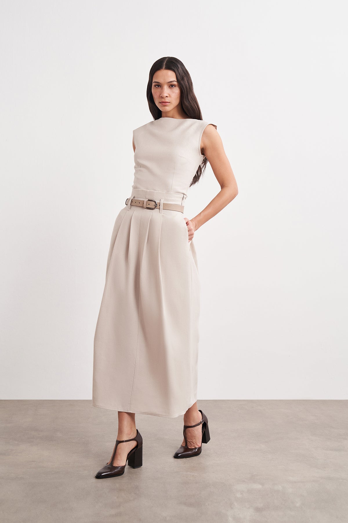 WINGCOTT Kemerli ve Pileli Düz Keten Etek