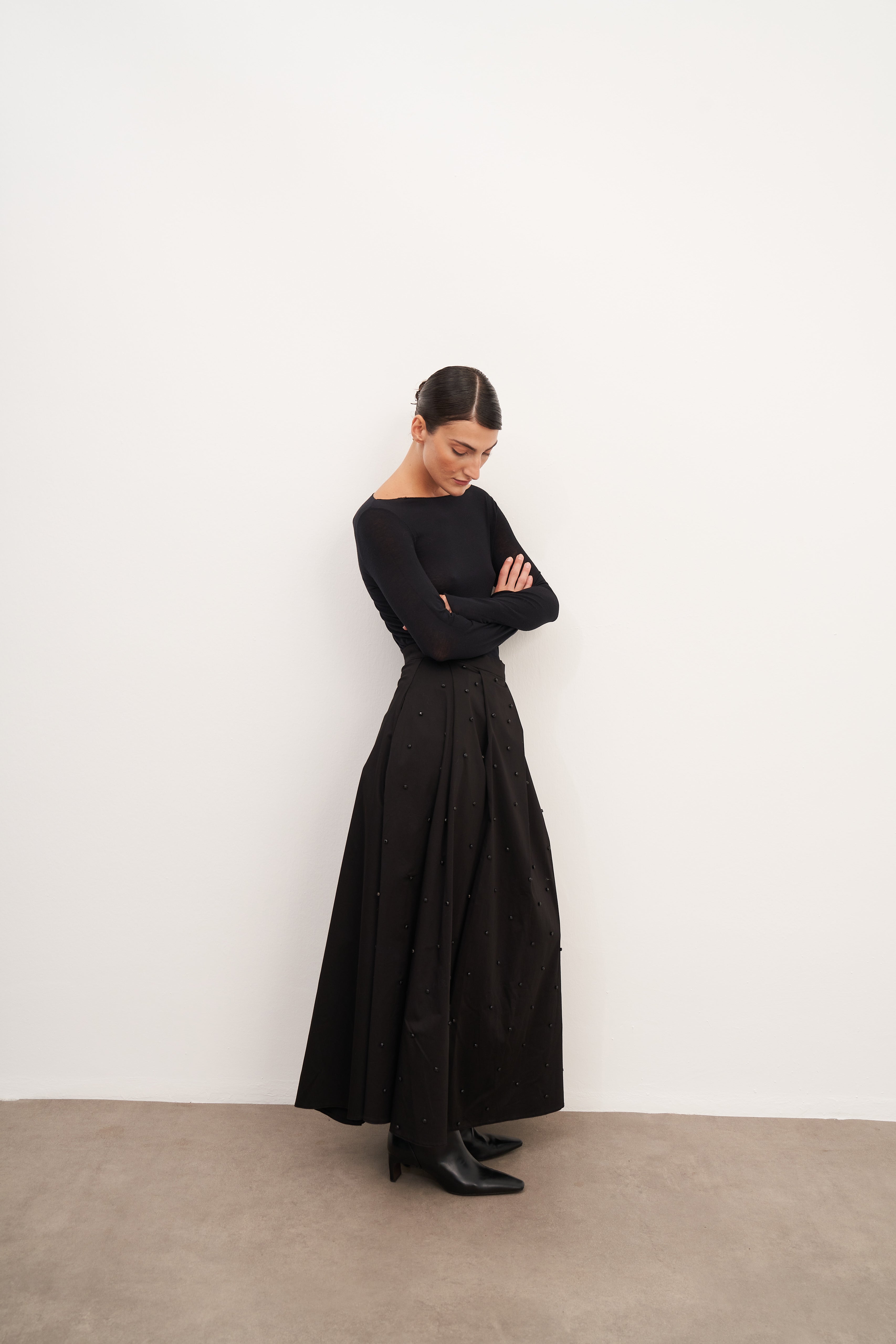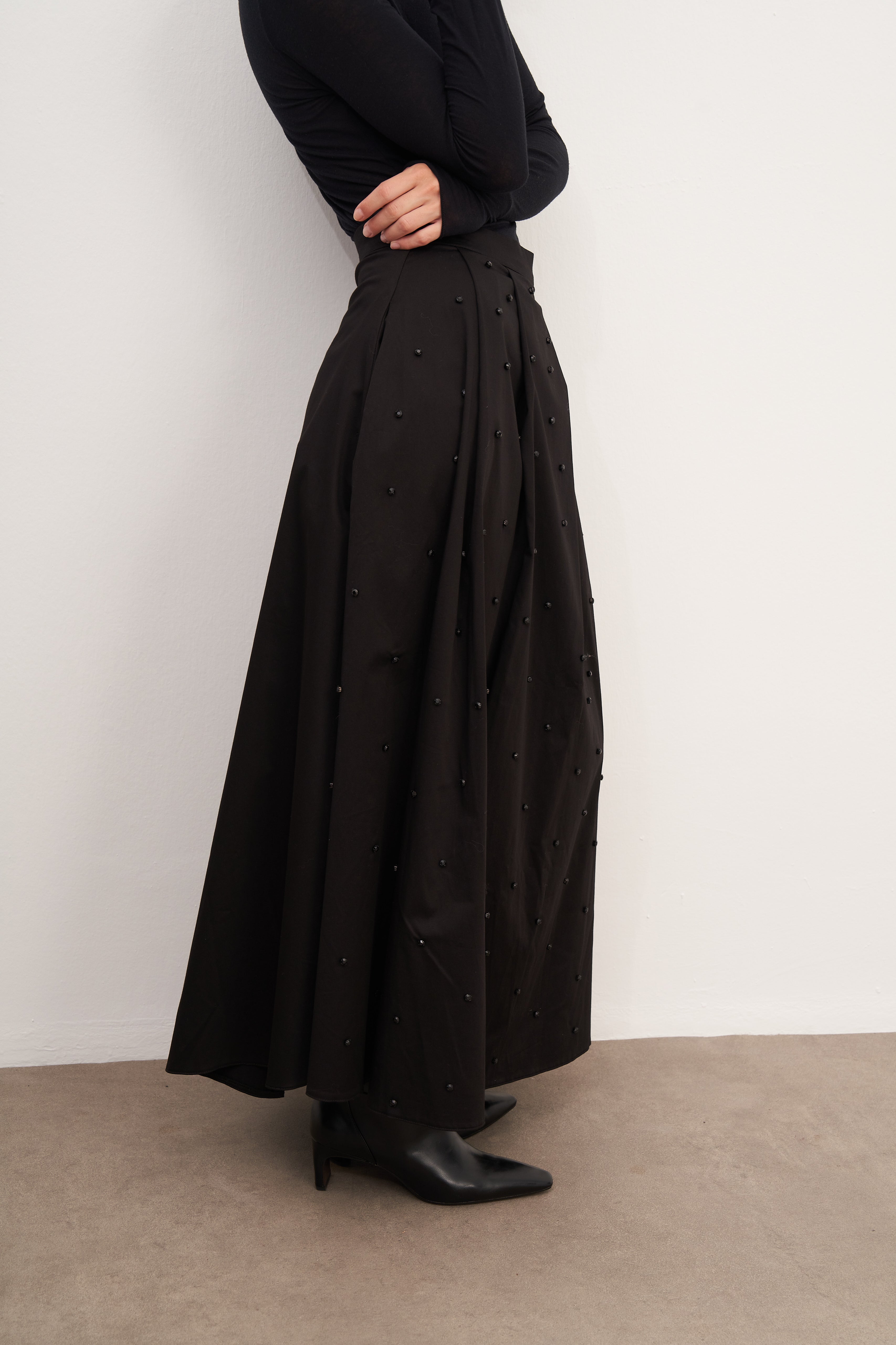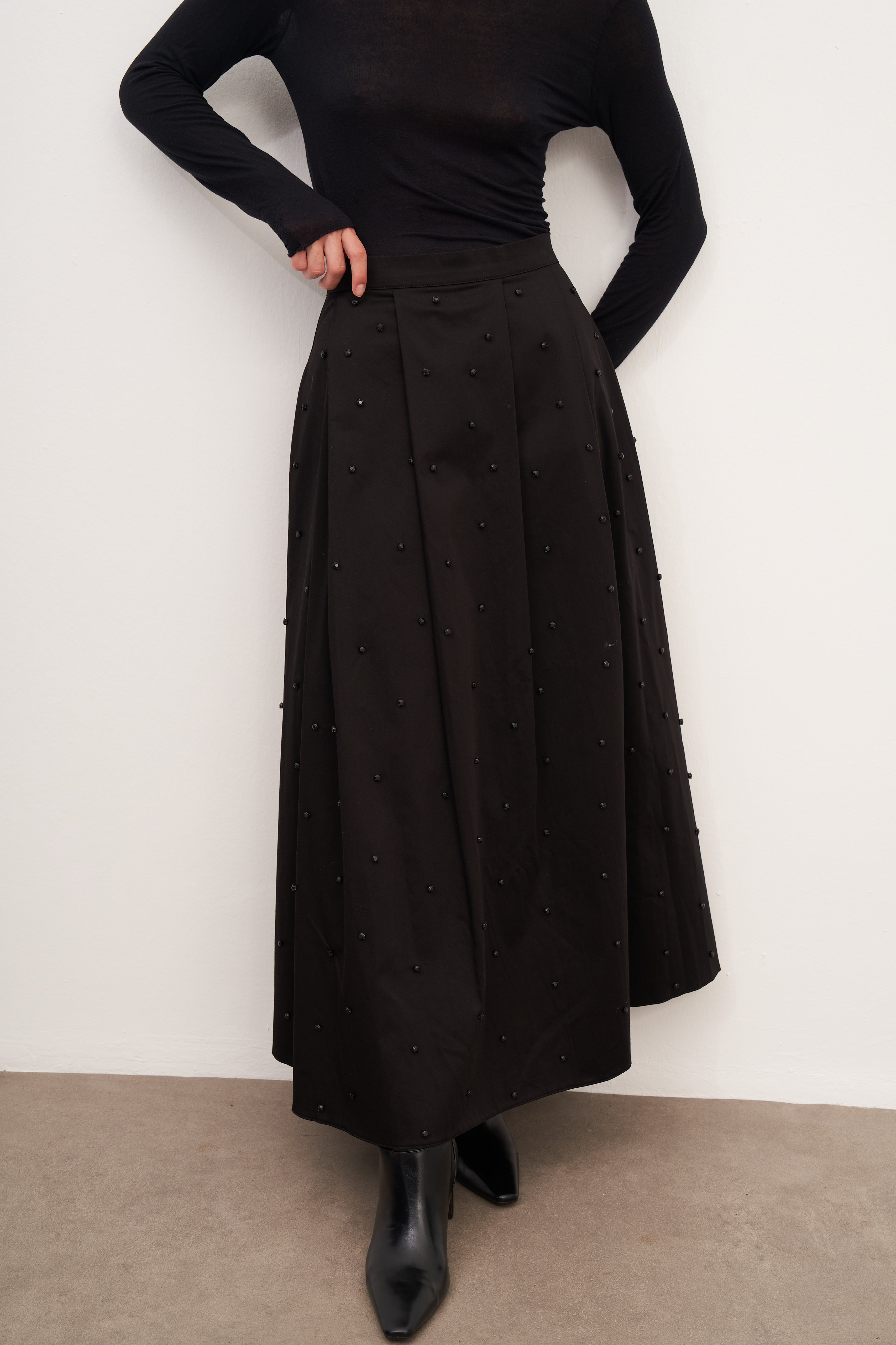 Siyah Taş İşlemeli Pileli Cep Detaylı Uzun Etek