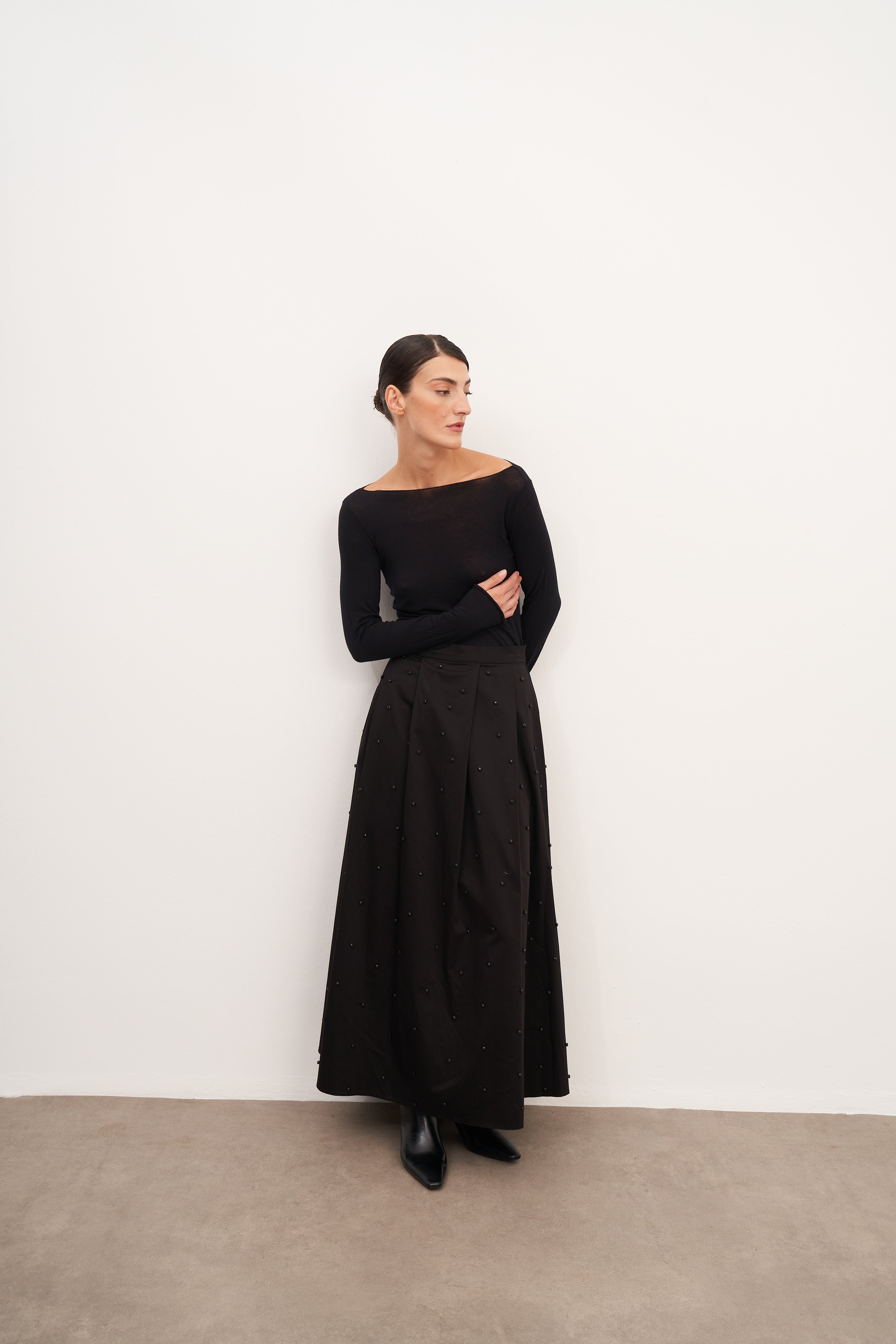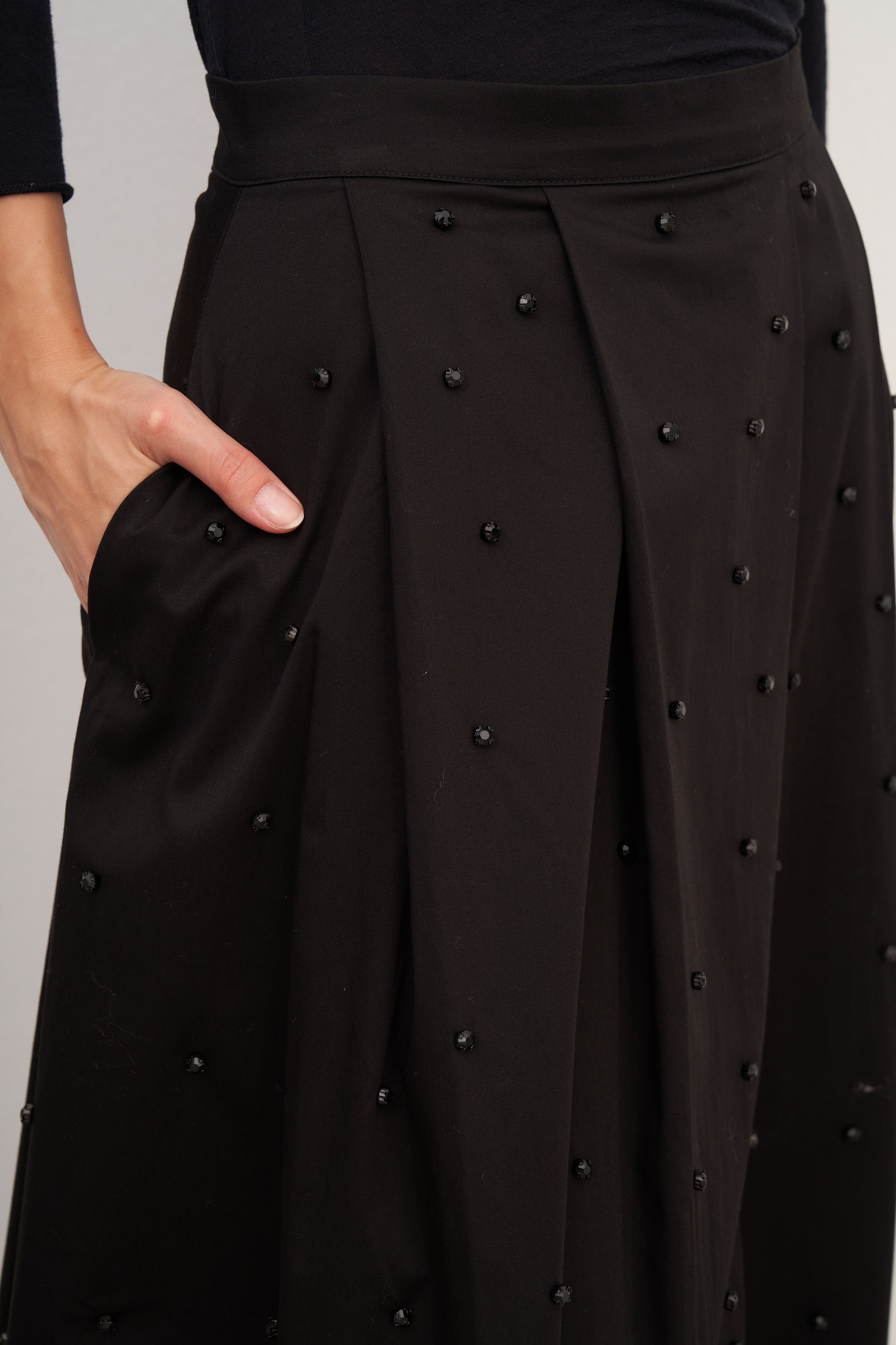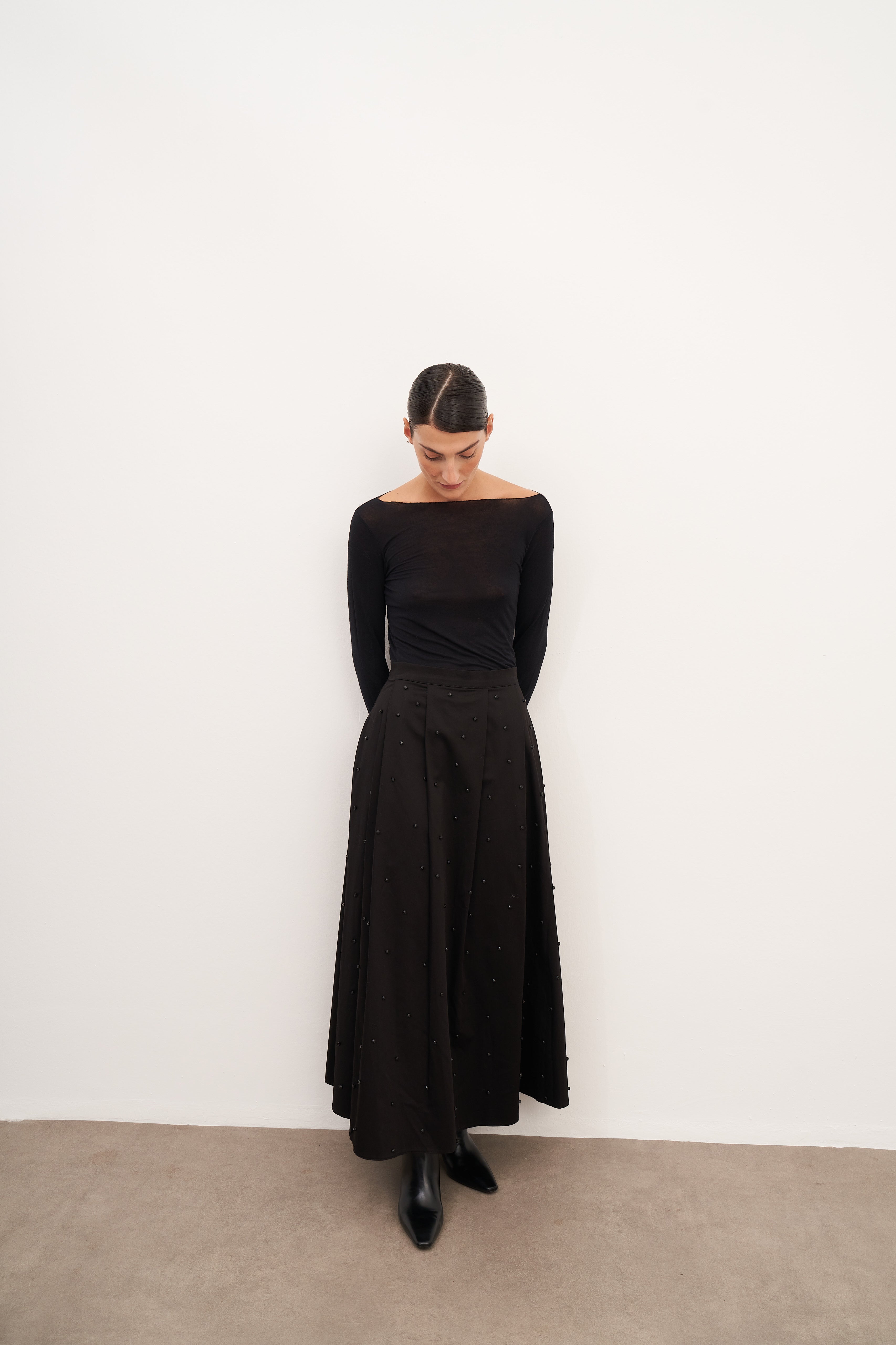Siyah Taş İşlemeli Pileli Cep Detaylı Uzun Etek